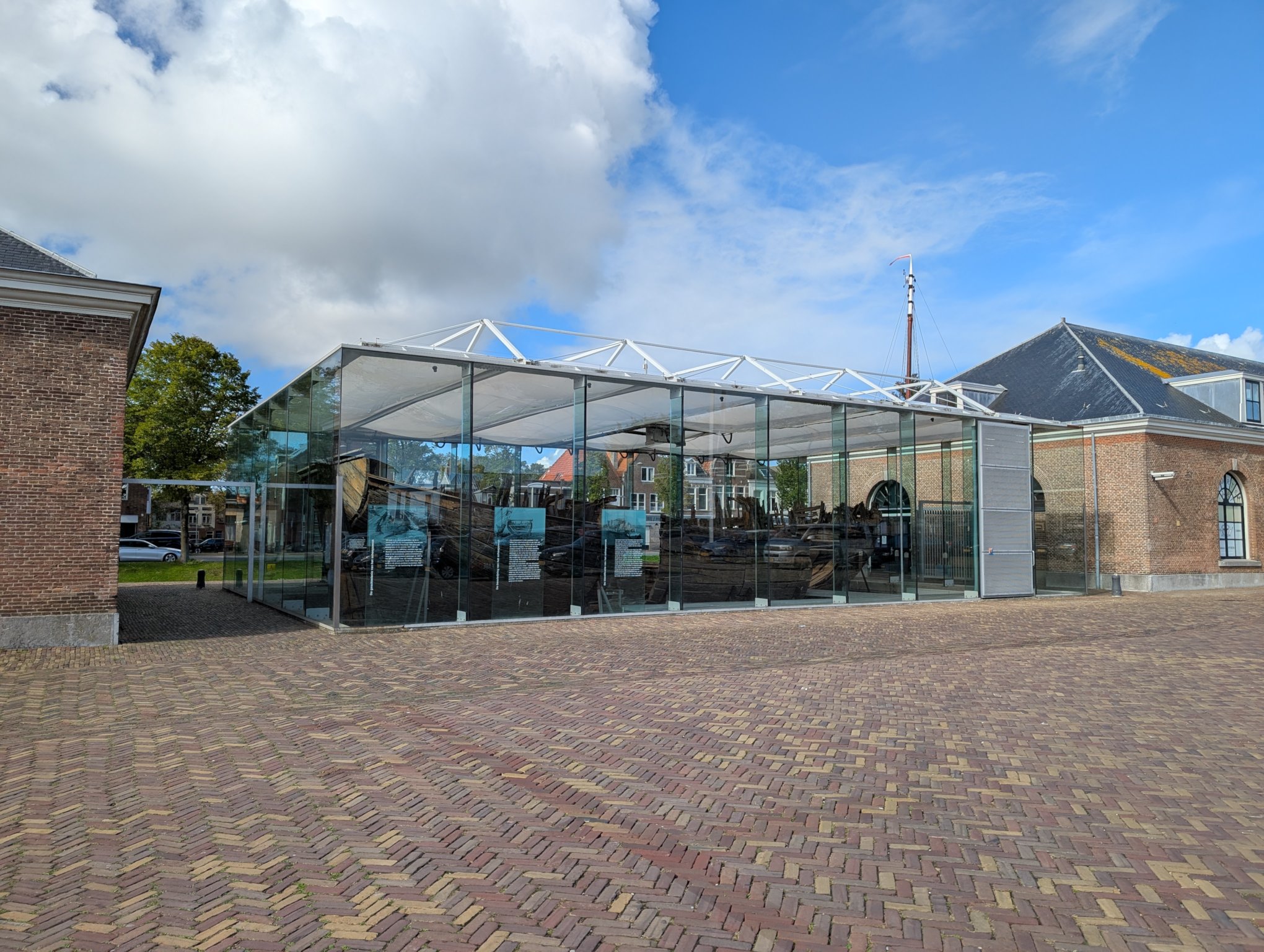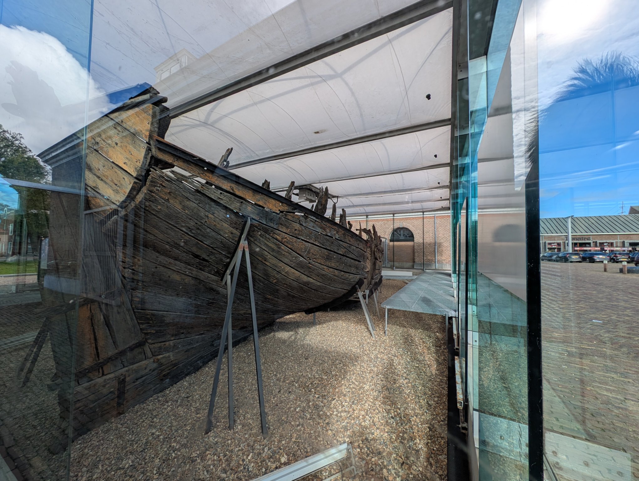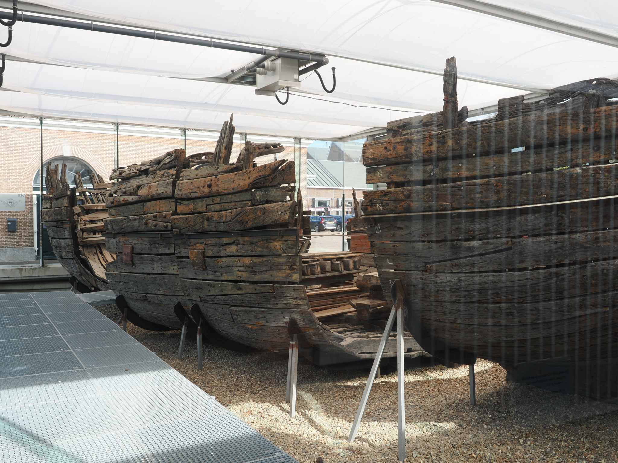 Das erste, worauf wir stoßen, ist ein altes Schiffswrack aus dem 17. Jahrhundert, das in einem Glasgebäude untergebracht ist. Bei Sonnenschein ist es etwas schlecht zu photographieren, da die Scheiben spiegeln. Im Dunkeln ist das Wrack auch beleuchtet.