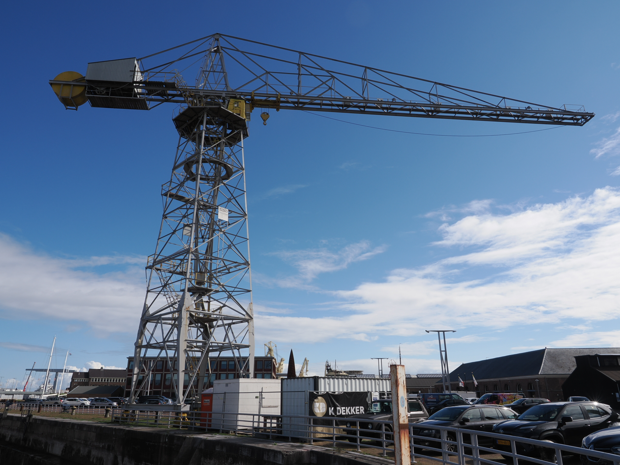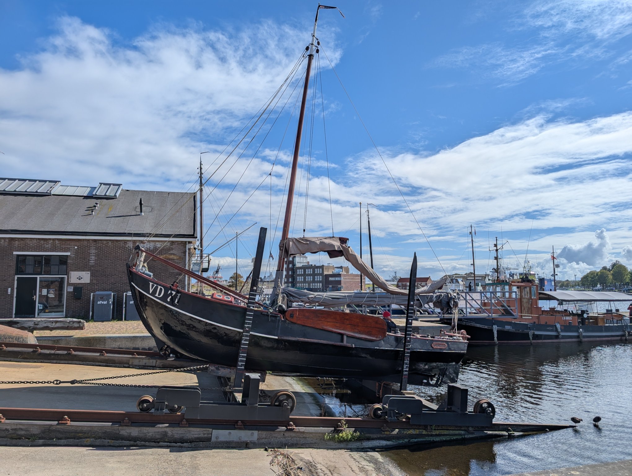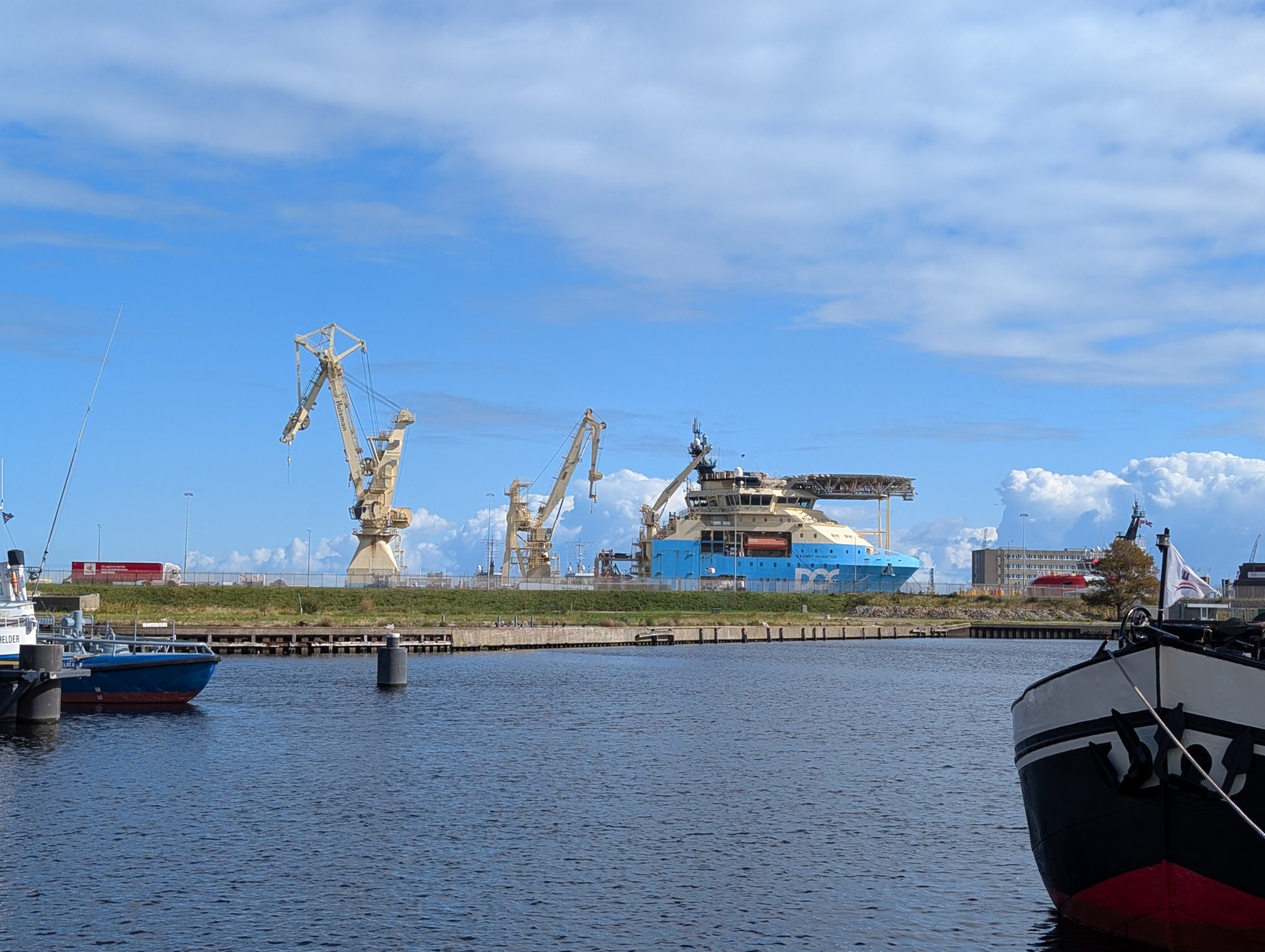 Plattbodenschiffe und das Feuerschiff, das wir am Vortag schon gesehen hatten, befinden sich am südlichen Ende von Willemsoord. Außerdem kann man von hier aus ein Arbeitsschiff für irgendwelche Offshore-Infrastruktur, Plattformen oder Windräder, mit seinem Hubschrauberlandeplatz sehen.