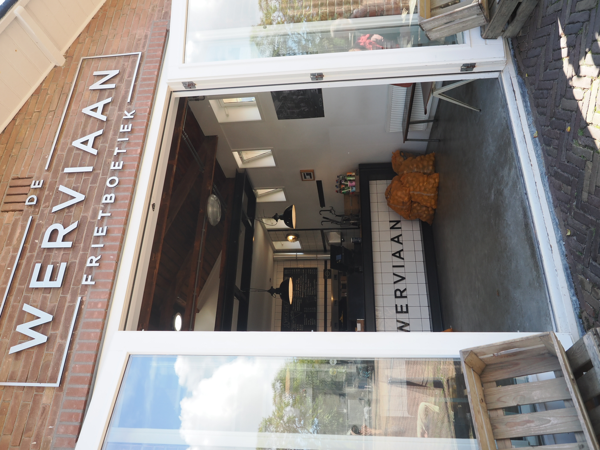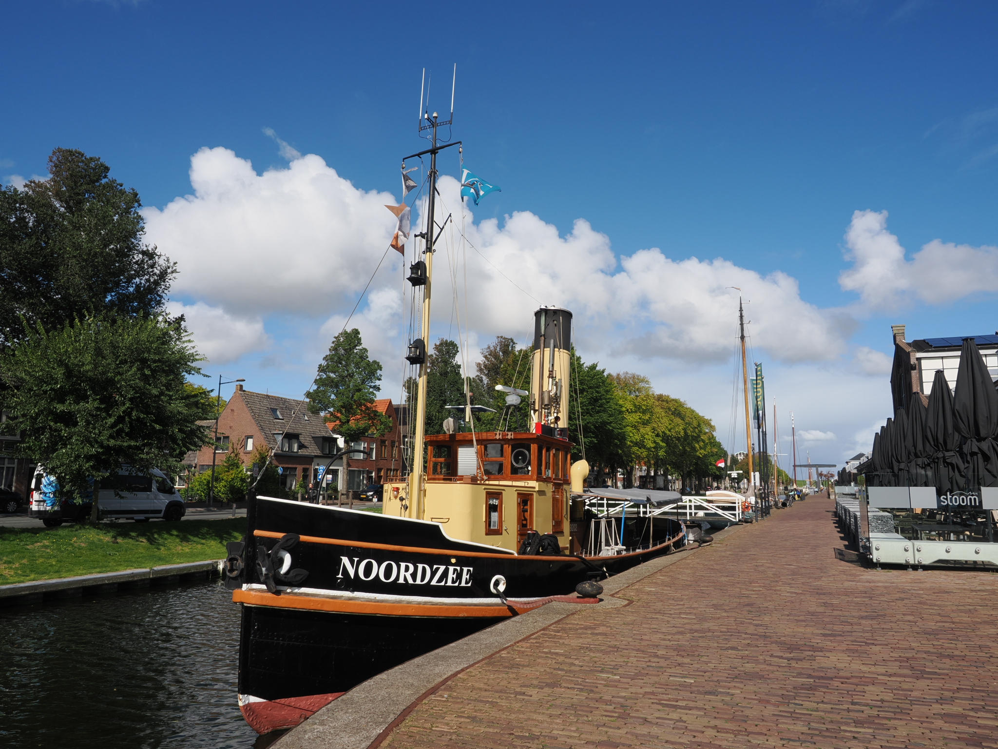 Am Werftkanal entlang gehen wir zurück Richtung Norden. Dort liegt der Dampfschlepper Nordzee. Auf halbem Weg kommen wir wieder an einem Imbiss vorbei, der uns auf dem Hinweg schon aufgefallen ist. Während wir auf unser Essen warten, reinigen ein paar Dohlen Tische und Bänke. Dann geben wir uns Junkfood vom Feinsten: Pommes mit Frietsaus, Vleeskroket und Frikandel spesiaal. Zum Nachtisch gibt’s noch ein Softeis mit Soße (leider nicht geknipst).
