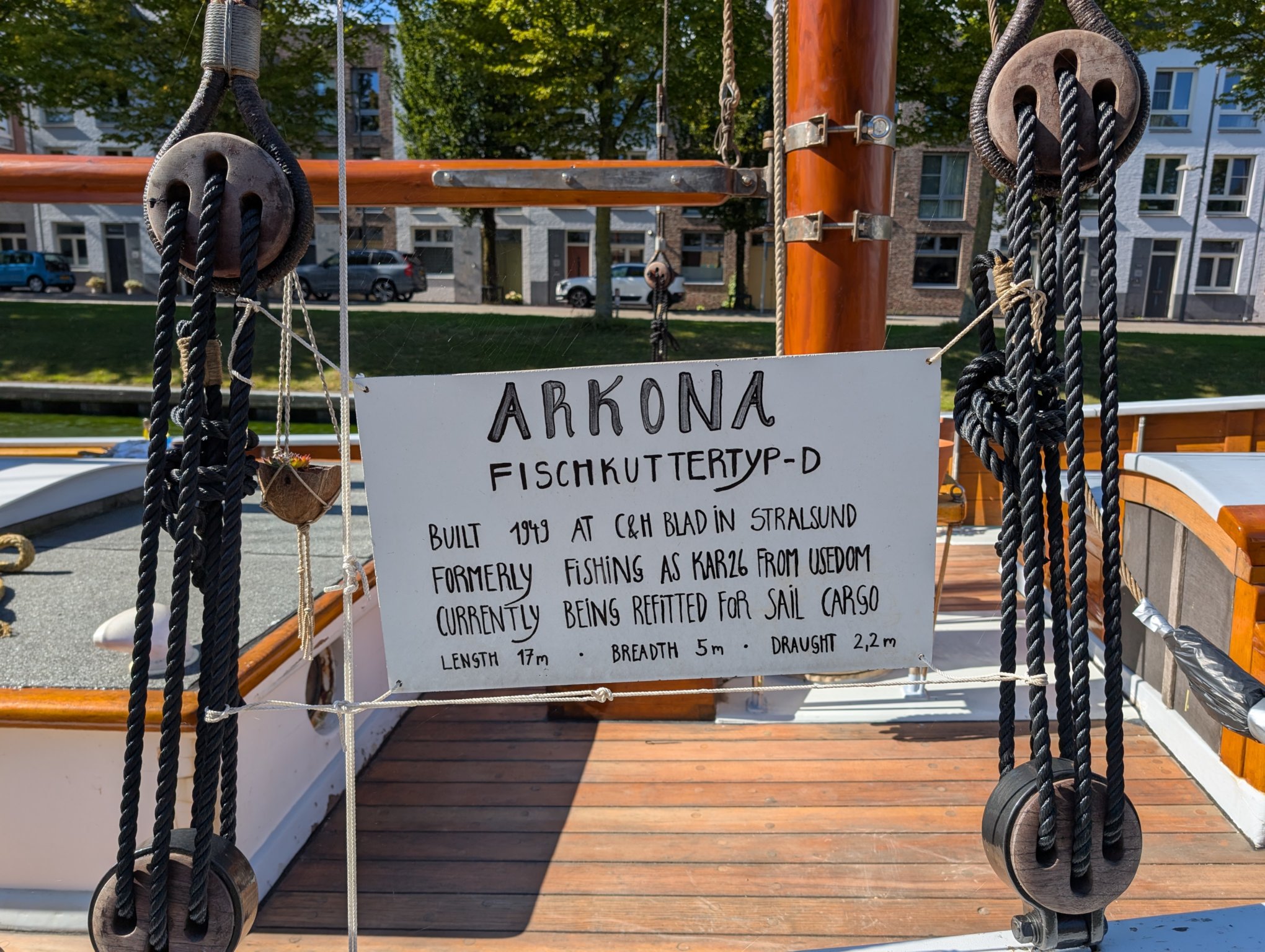 Auf unserem weiteren Weg kommen wir an einem Schiff vorbei, das in Stralsund gebaut wurde und nun hier liegt. Arkona heißt es, ist von 1949 und wird derzeit wieder fit gemacht als Segelschiff.
