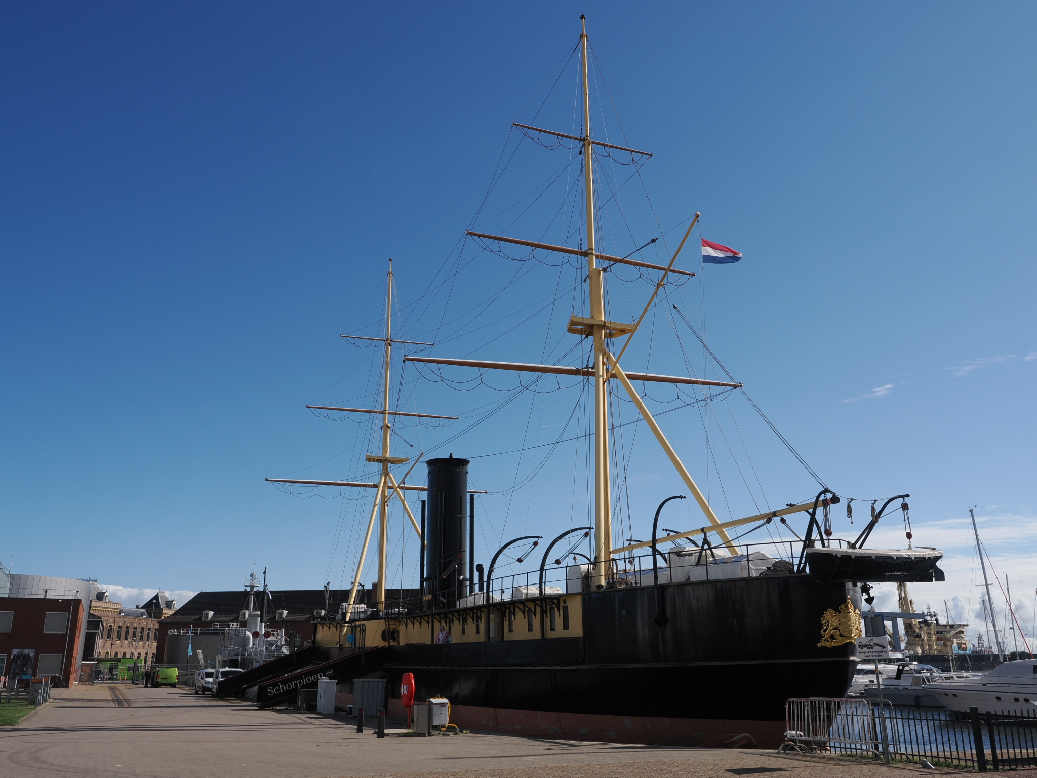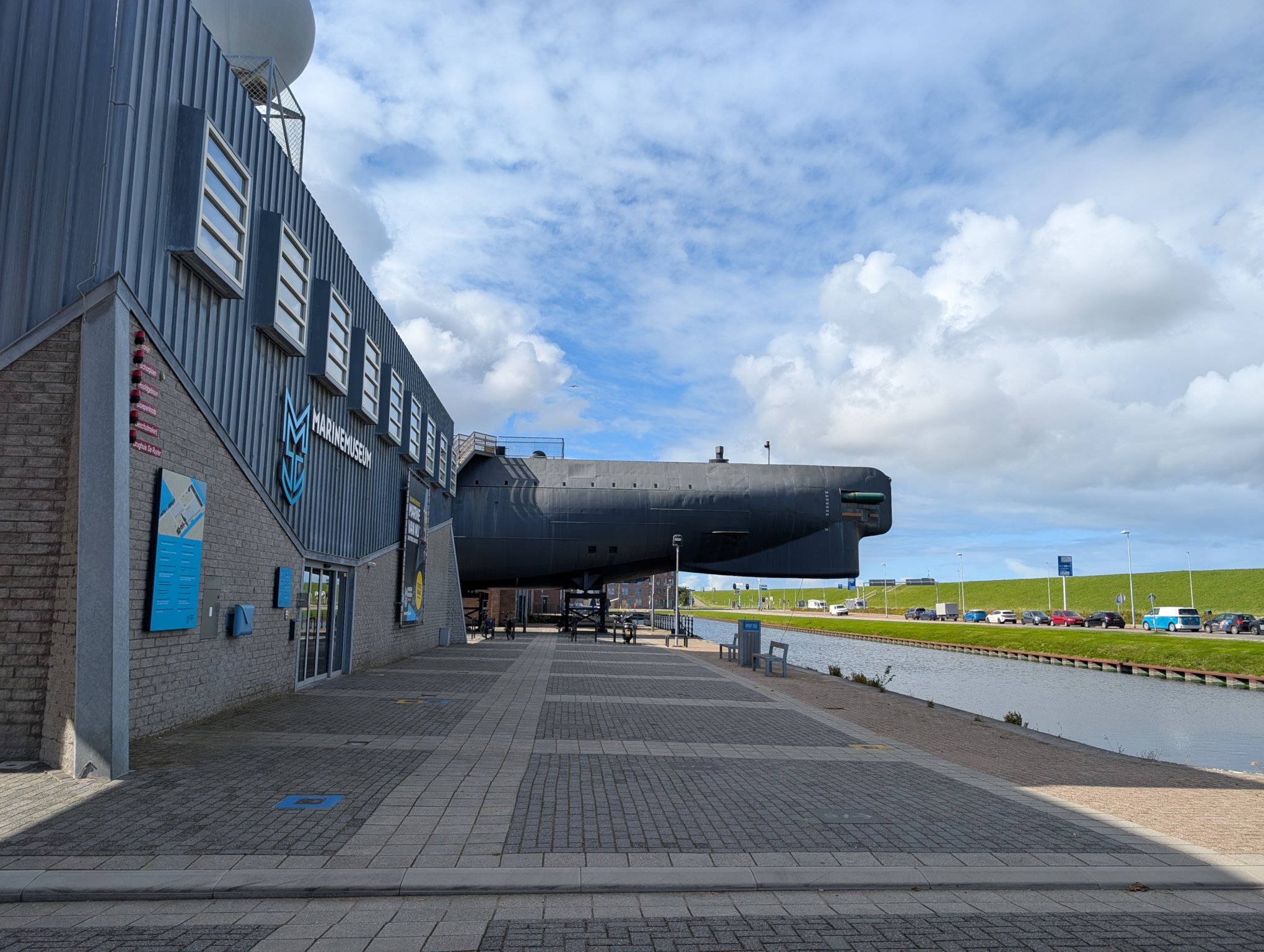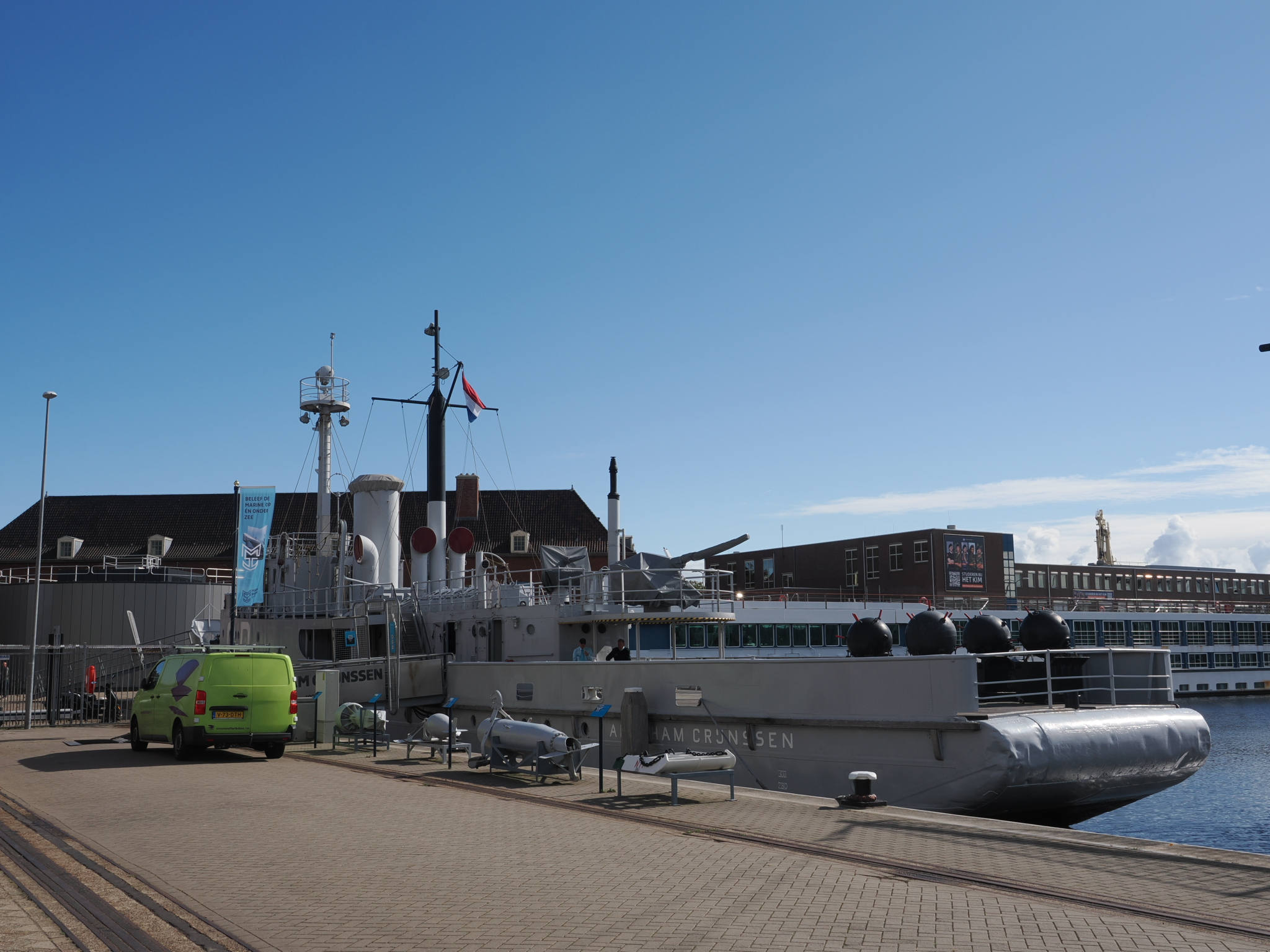 Kleine Anekdote am Rande: Auf dem Gelände, auf dem wir jetzt gerade herumlaufen und zu den beiden Schiffen gehen, die man ebenfalls besichtigen kann (wenn man eine Museums-Eintrittskarte hat), sind wir bei der Parkplatzsuche ebenfalls herumgefahren. Auch am Schild vorbei, das auf militärisches Gelände hinweist. Wir haben dann schnell wieder kehrt gemacht, bevor wir Ärger mit der niederländischen Marine bekommen.