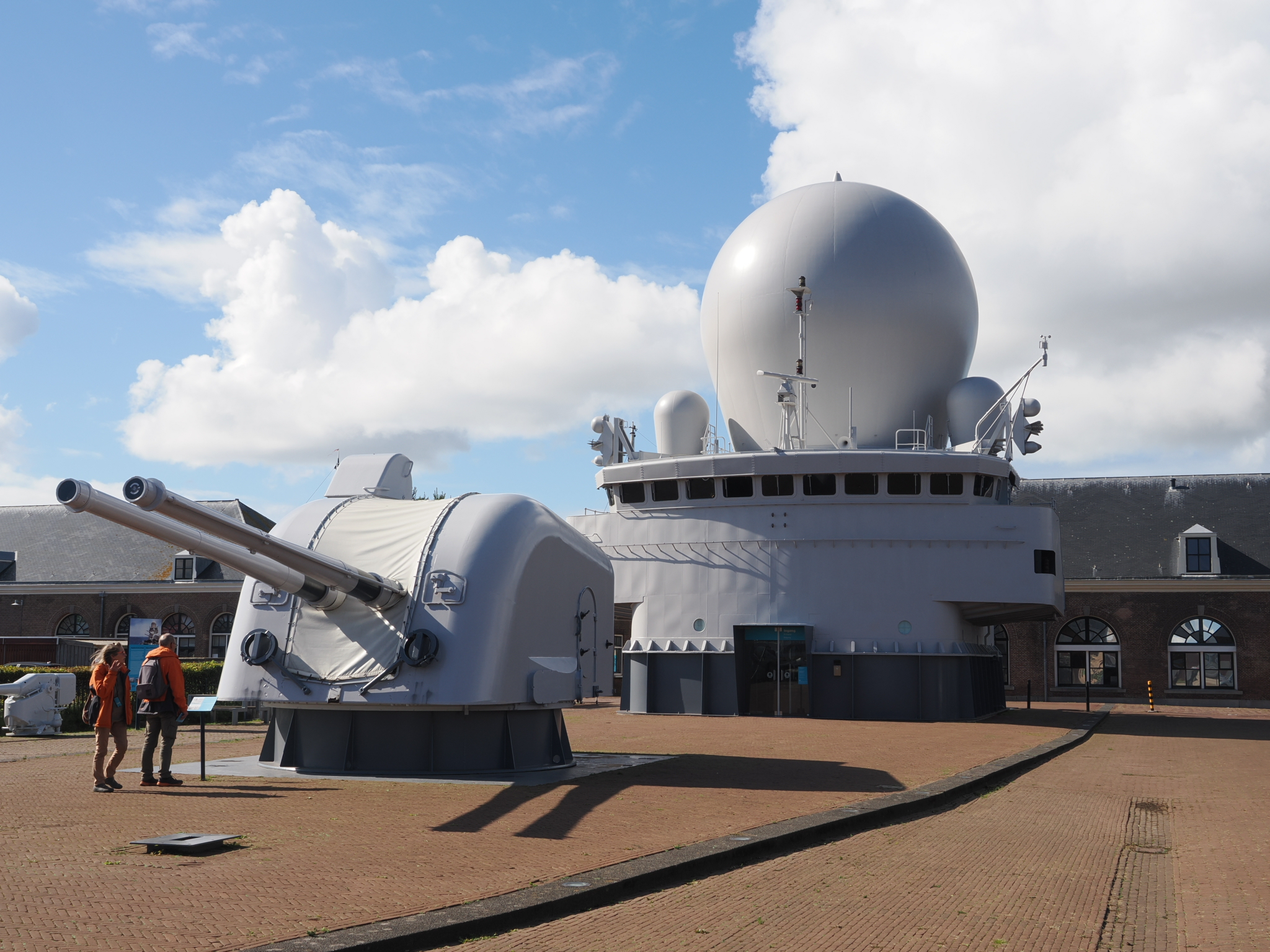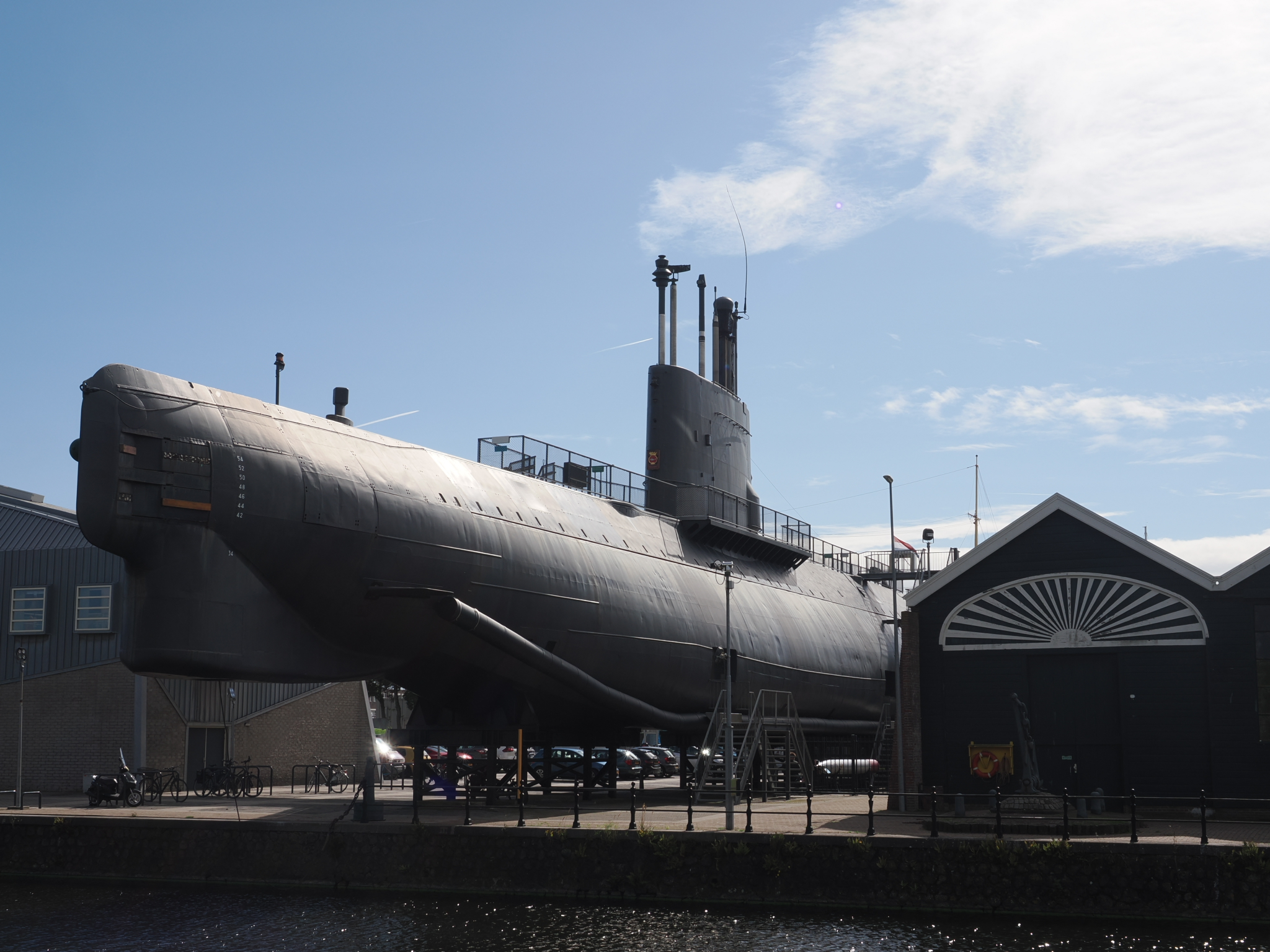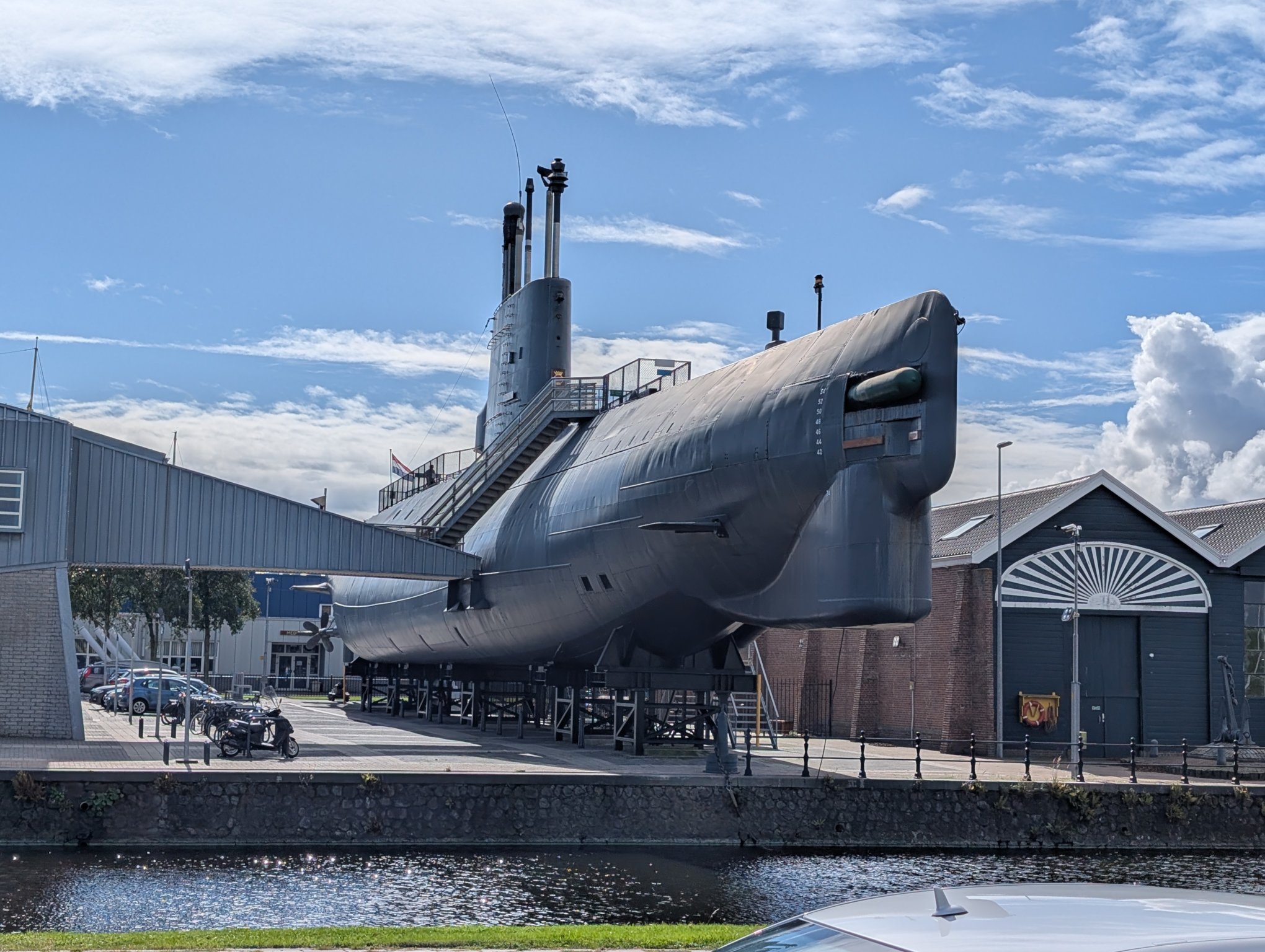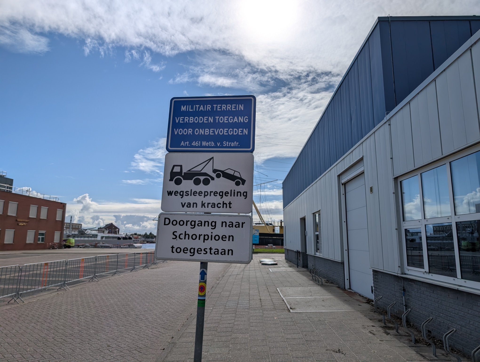 Kleine Anekdote am Rande: Auf dem Gelände, auf dem wir jetzt gerade herumlaufen und zu den beiden Schiffen gehen, die man ebenfalls besichtigen kann (wenn man eine Museums-Eintrittskarte hat), sind wir bei der Parkplatzsuche ebenfalls herumgefahren. Auch am Schild vorbei, das auf militärisches Gelände hinweist. Wir haben dann schnell wieder kehrt gemacht, bevor wir Ärger mit der niederländischen Marine bekommen.