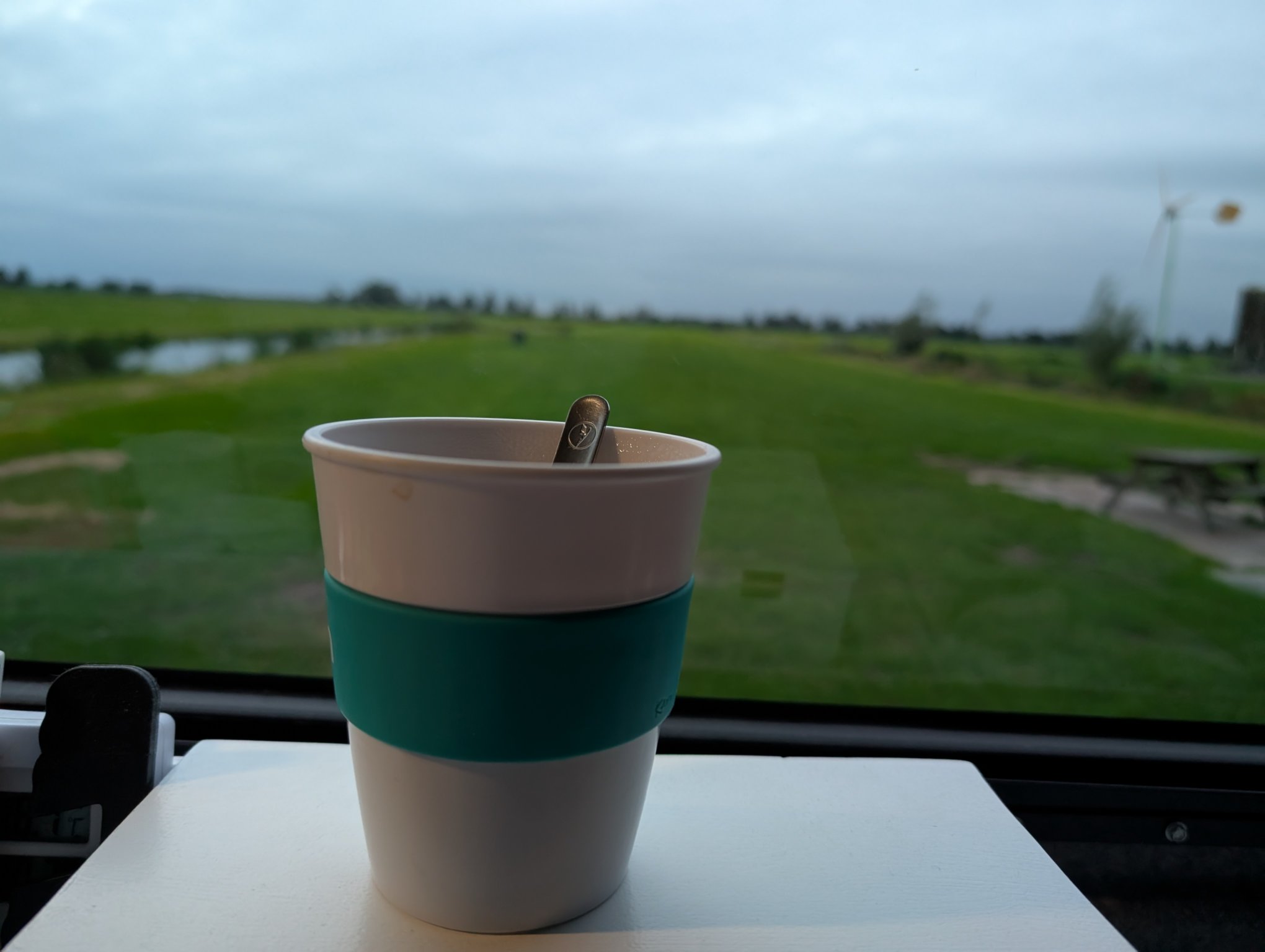 Der Morgenblick aus dem Camper ist ein wenig verschwommen, mein Focus liegt auf dem Kaffee. Der Focus des Silberreihers liegt auch am frühen Morgen schon auf Fisch.