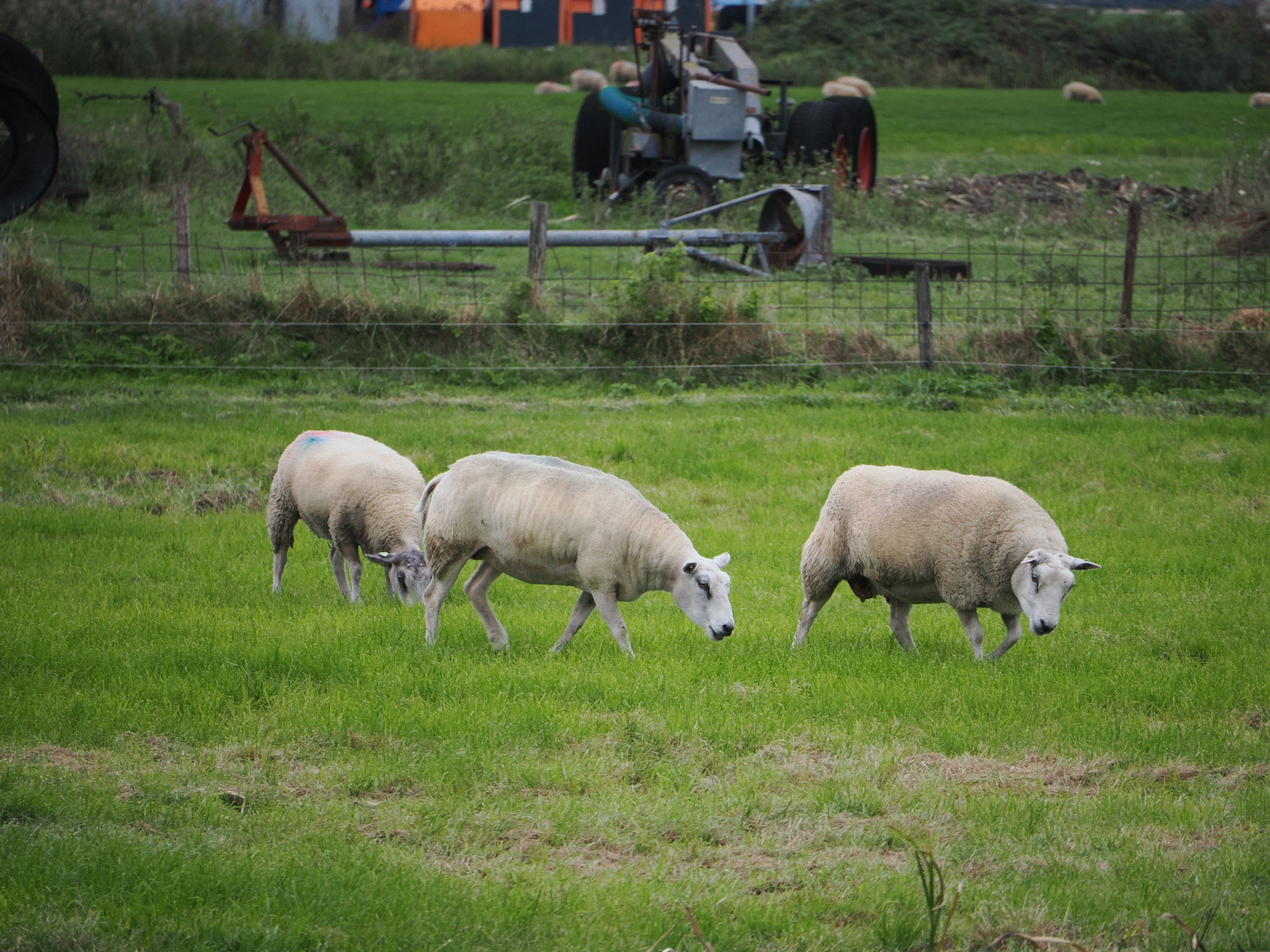 Der Bauer fährt auf der Wiese nebenan mit seinem Quad hin und her. Er verstellt die Tore zwischen den Wiesen und guckt, ob der Zaun in Ordnung ist. Dann holt er ein paar Stangen und Draht für einen mobilen E-Zaun, mit dem er eine Wiese abteilt. Alles deutet darauf hin, dass hier gleich irgendwelche Tiere auf die Wiese kommen. Der Bauer verschwindet hinter dem Gebäude und kommt nach einer Weile um die Ecke getrabt. Hinter ihm eine kleine Schafherde.