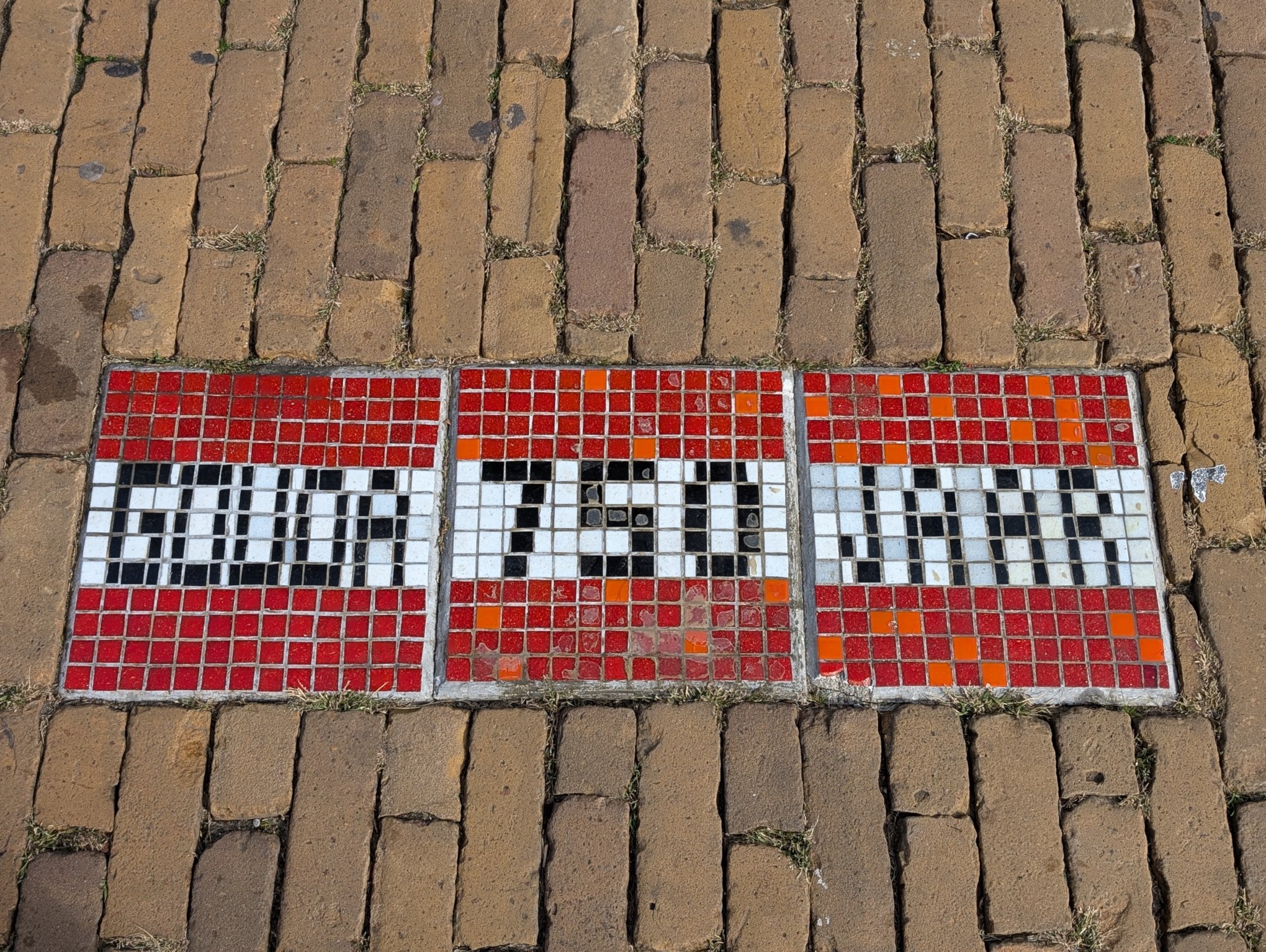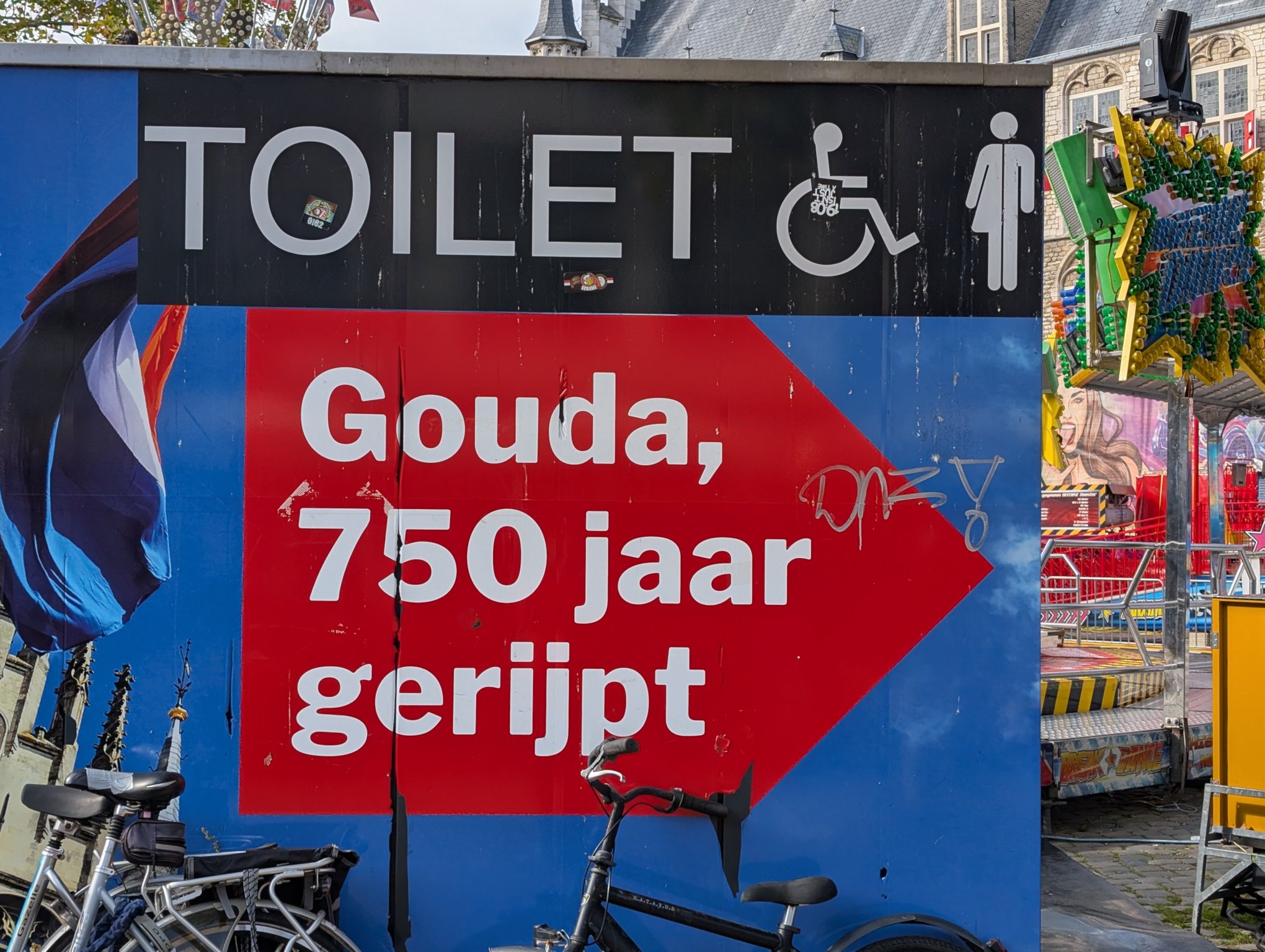 Vor dem Stadhuis hat die Stadt ihren Stolz ins Pflaster eingelassen. Und an einem Toilettenhäuschen ist auch noch groß die Werbung für das Alter der Stadt. Die 750-Jahrfeier war 2022. Aber der Marketingspruch ist immer noch gut.