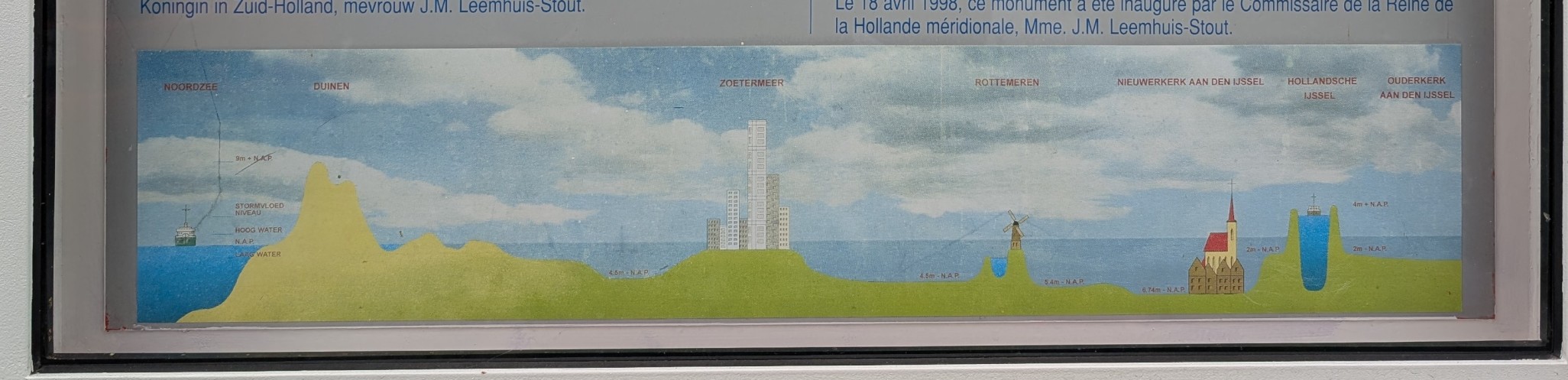 Der erste davon ist der tiefste Punkt der Niederlande. Dieser liegt sagenhafte 6,74 Meter unterhalb des Meeresspiegels (NAP, Amsterdamer Pegel). Das ist mit einer eindrücklichen Säule dargestellt.