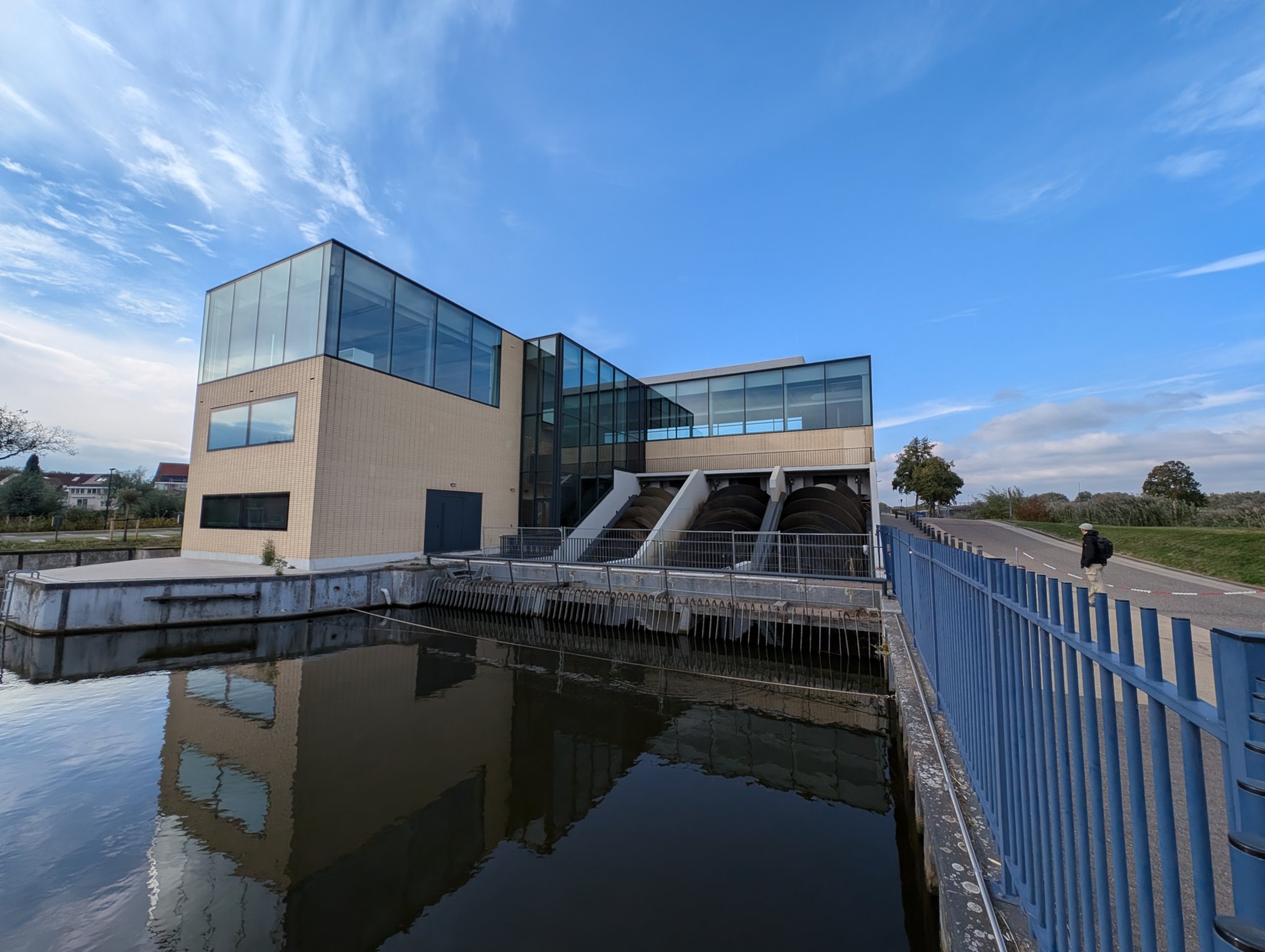 Nach einem letzten Blick auf die Mühlen und auf einen Haubentaucher gehen wir wieder zurück Richtung Parkplatz, vorbei am Pumpwerk, das heute das Wasser aus den Poldern abpumpt.