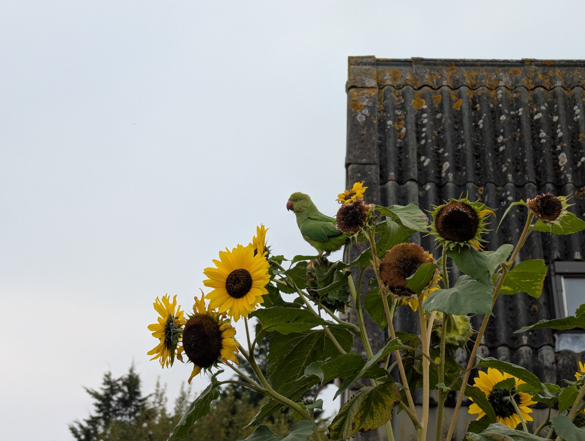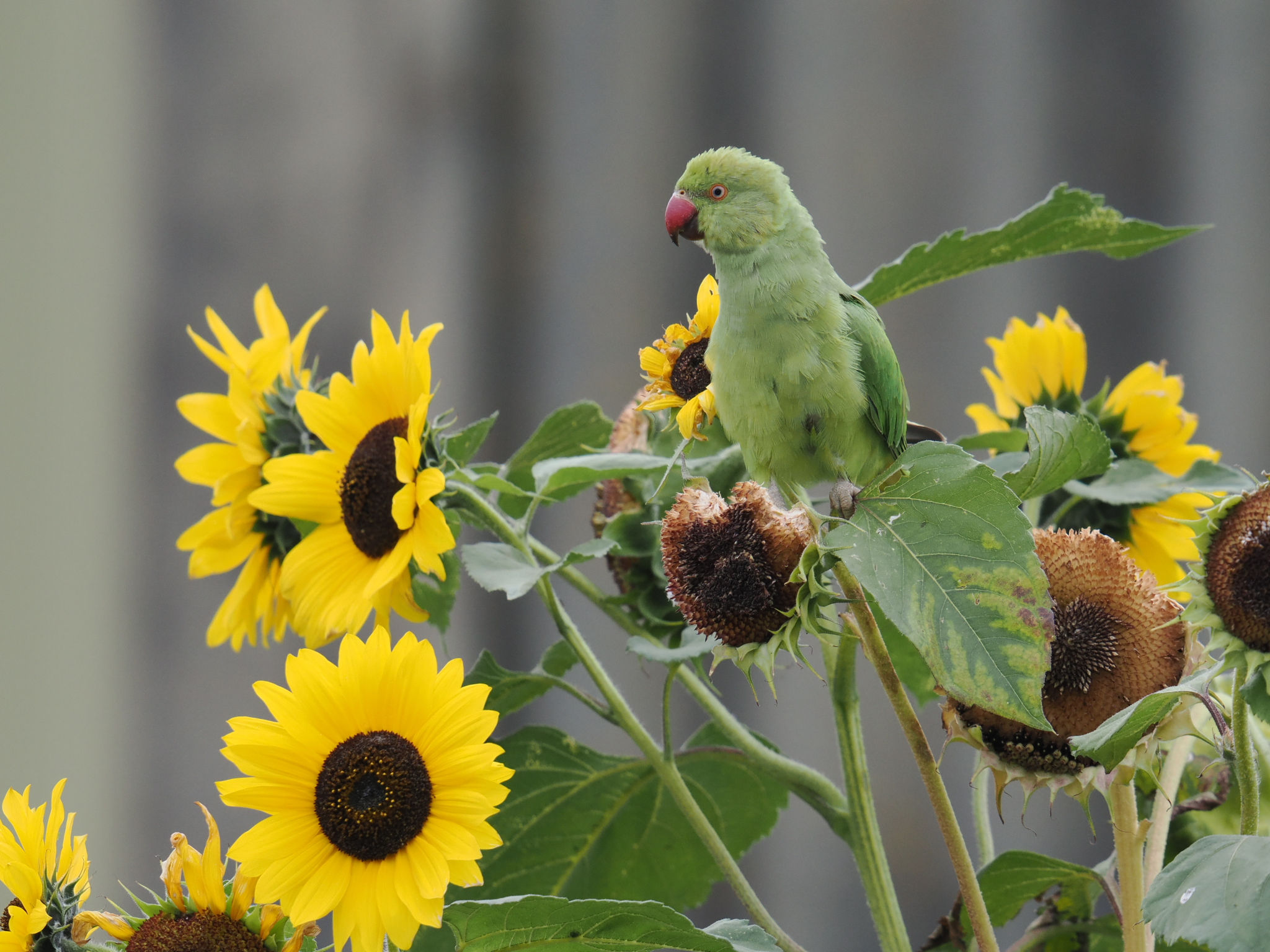 Später im Ort werde ich aber eines Besseren belehrt, auf ein paar riesigen Sonnenblumen im Garten neben uns, landet ein grüner Vogel. Bei näherem Hinsehen sieht er wie ein Papagei genauer gesagt wie ein Halsbandsittich aus. Und es ist auch einer.
