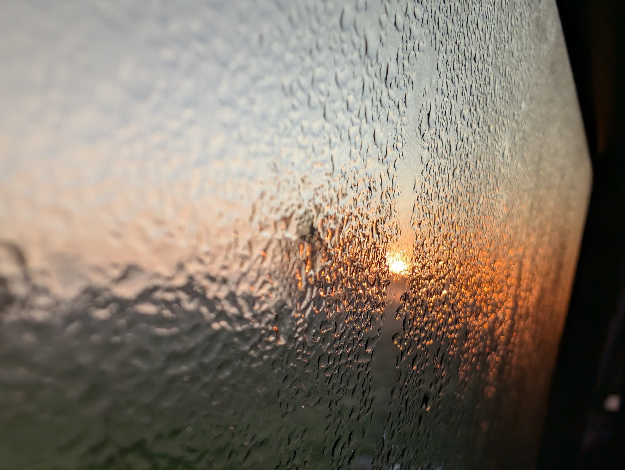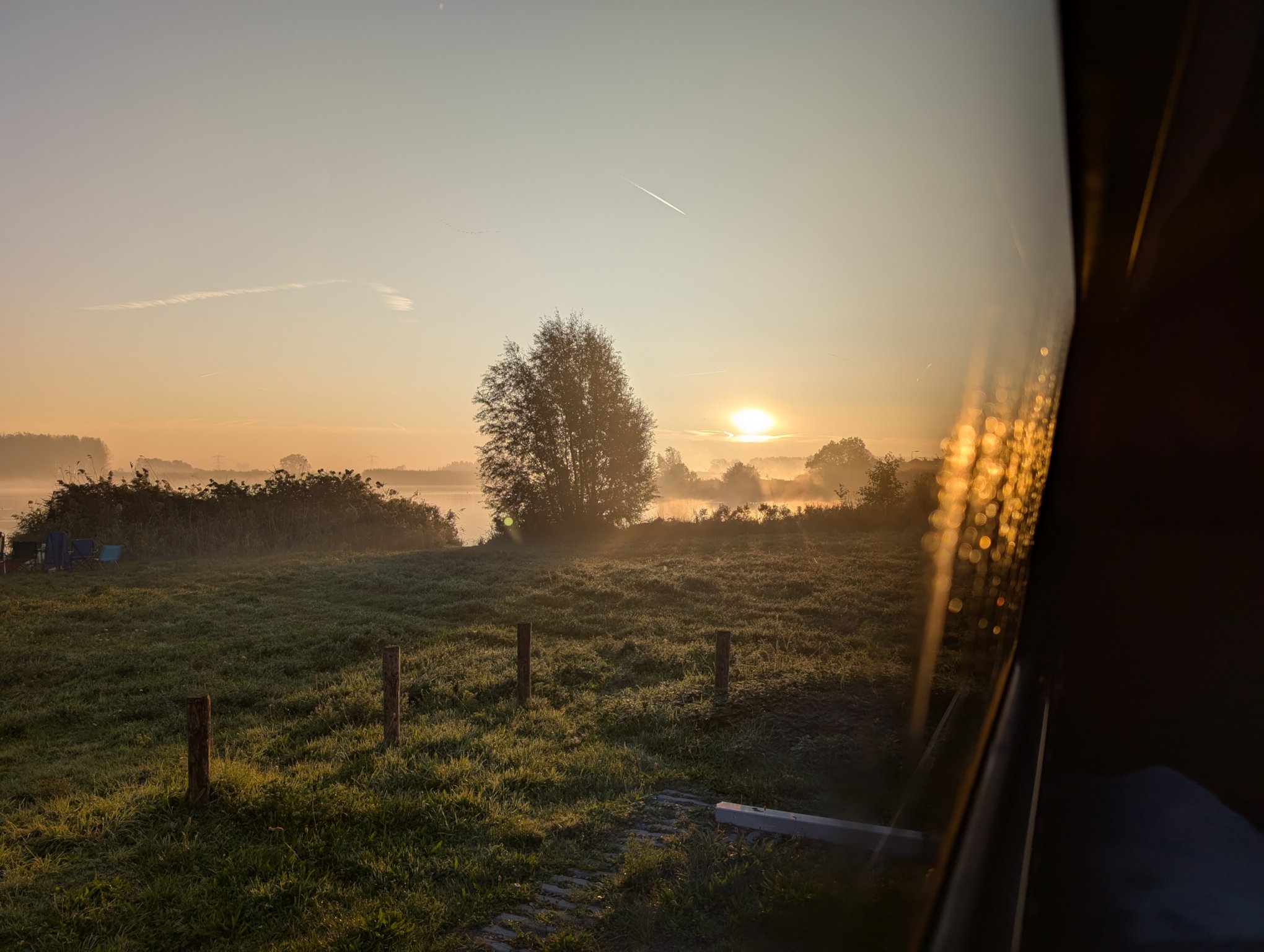 Die Scheiben sind übrigens von außen nass. Die Luftfeuchtigkeit ist so hoch, dass das ganze Auto von einer Wasserschicht überzogen ist. Aber die Heizung im Camper wärmt die Scheiben schnell auf und das Wasser trocknet ab. Die Sonne geht auf und meine Verfassung bessert sich.