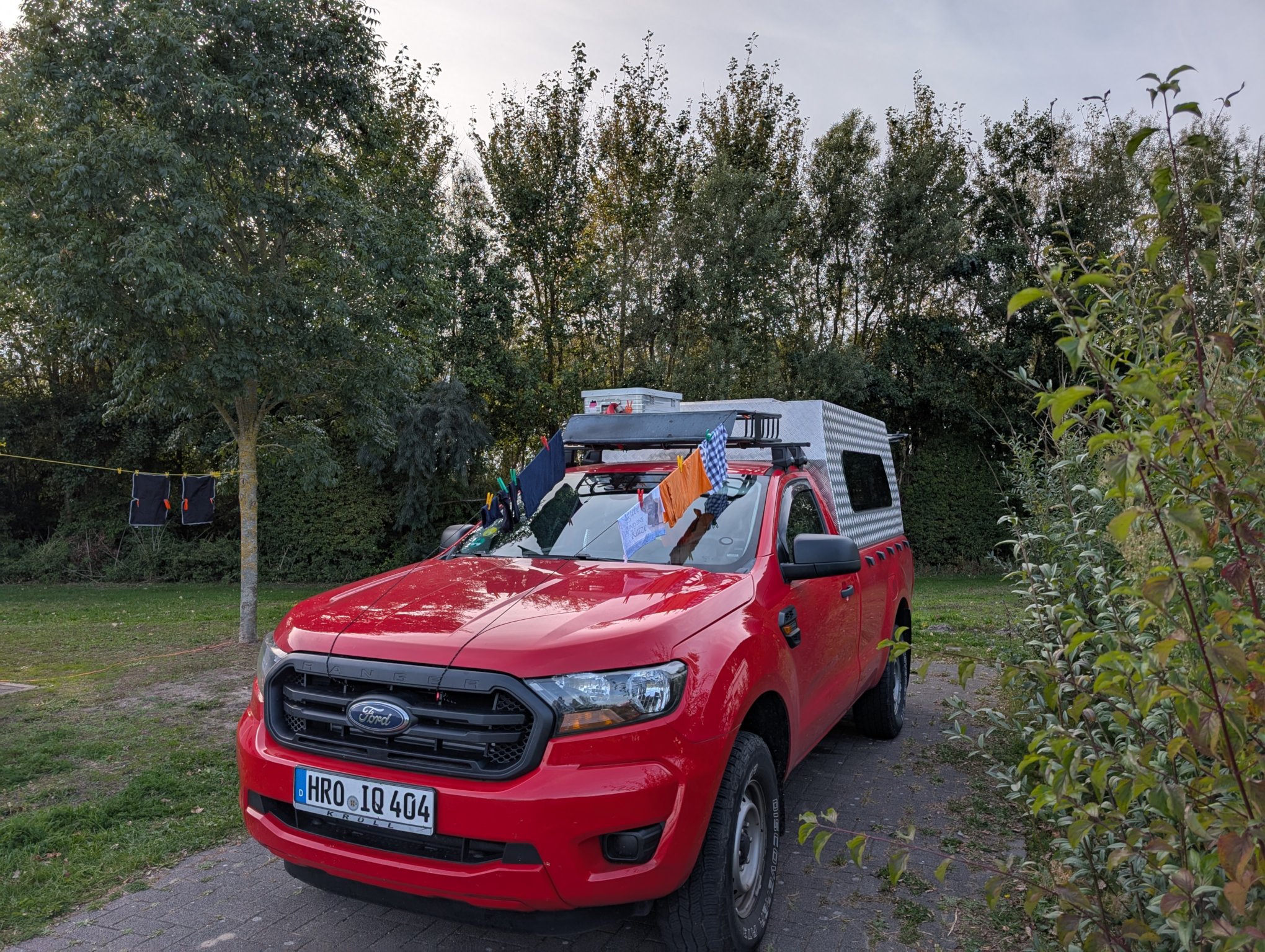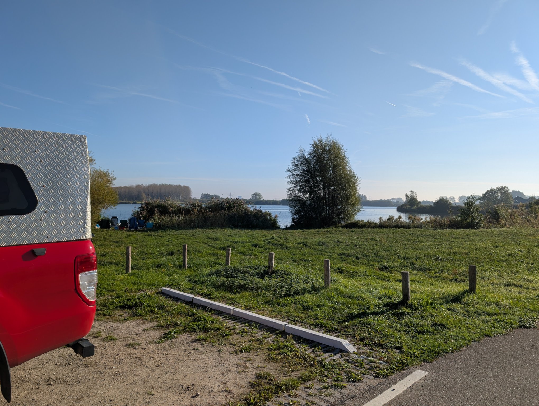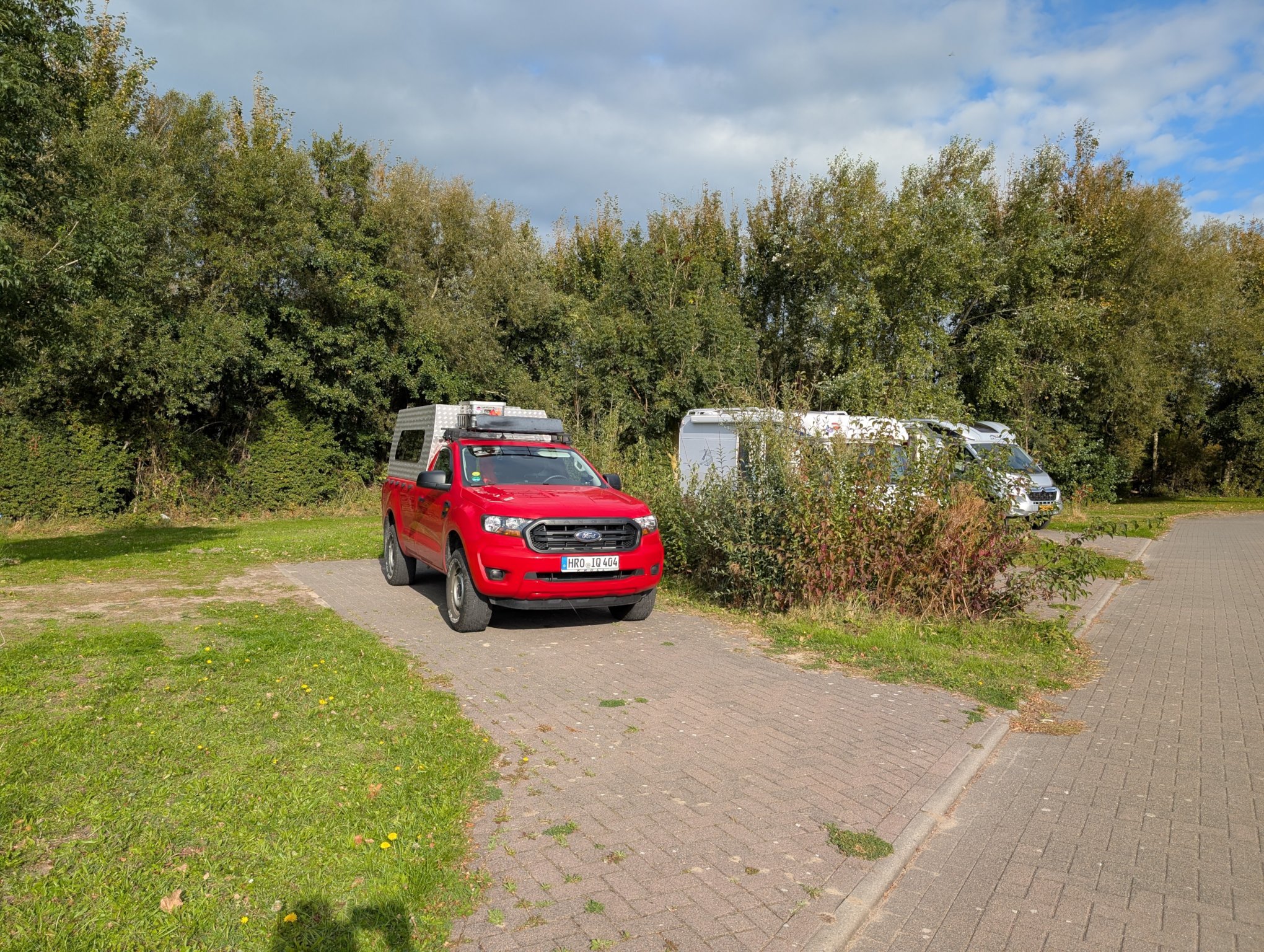 Beim Strandcamping Groede gibt es auf dem Parkplatz ein paar Stellplätze für Camper, die keine Campingplatz-Infrastruktur benötigen. Auf einem davon quartieren wir uns ein.