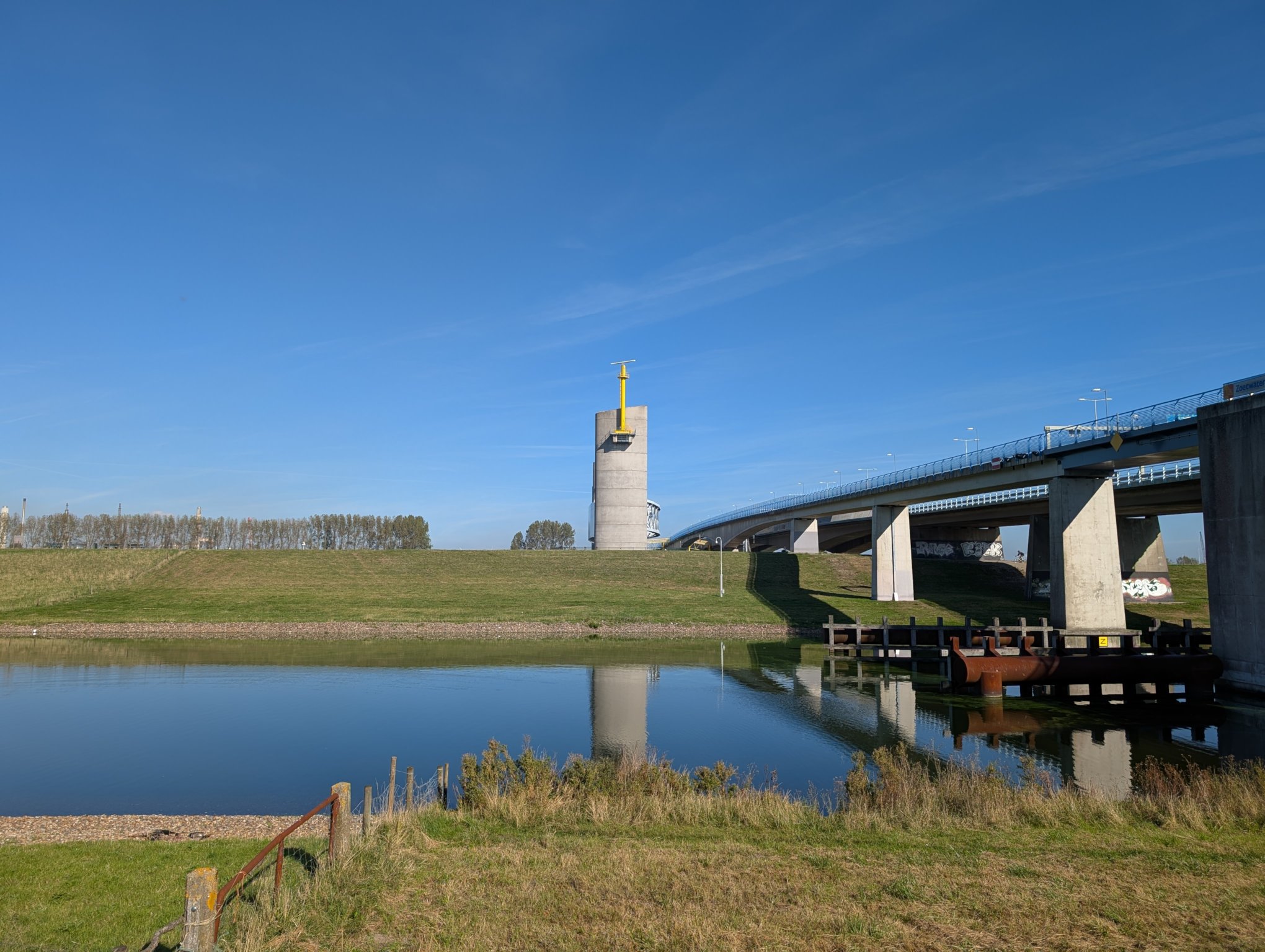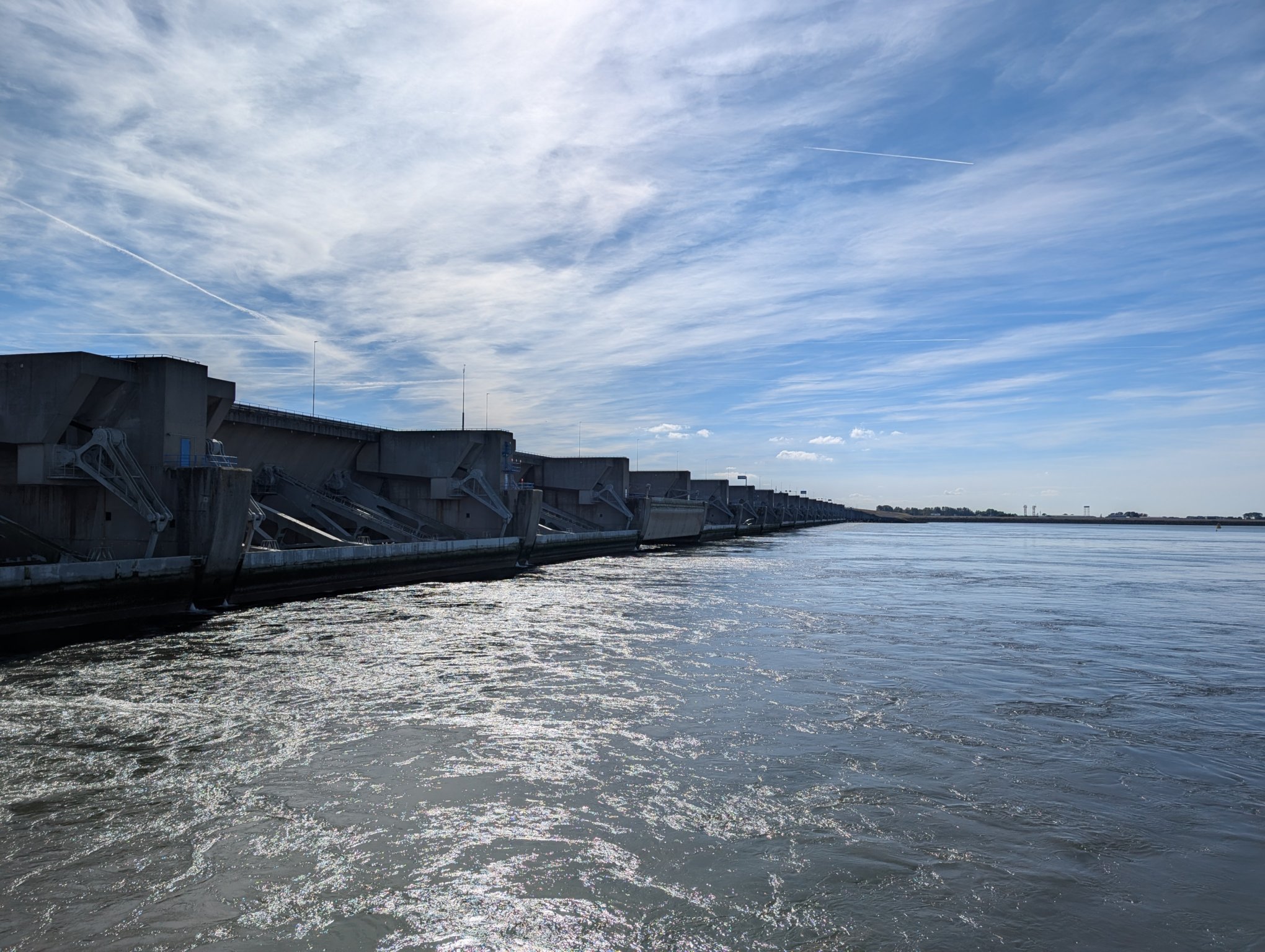 Das nächste Sperrwerk ist ein solches an der See, der Haringvlietdam. Der fünf Kilometer lange Damm ist mit 17 Hubtoren ausgestattet, die bei einer Sturmflut komplett geschlossen werden, ansonsten den Wasserstand auf der Landseite regulieren.