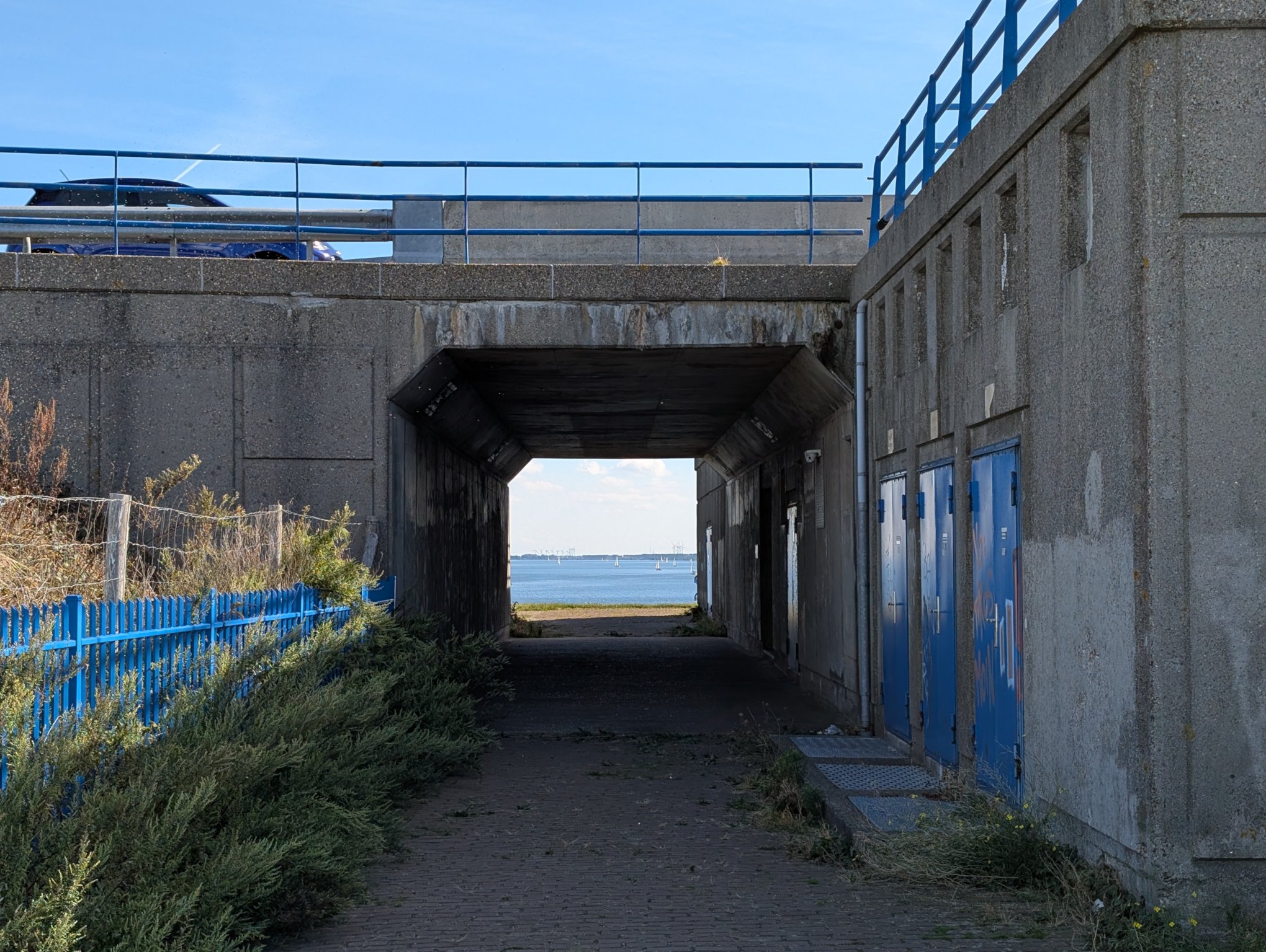 Ich hatte schon befürchtet, von der anderen Seite können wir uns das gar nicht anschauen, aber es gibt eine Unterführung zur Seeseite. Da gehen wir natürlich hin.