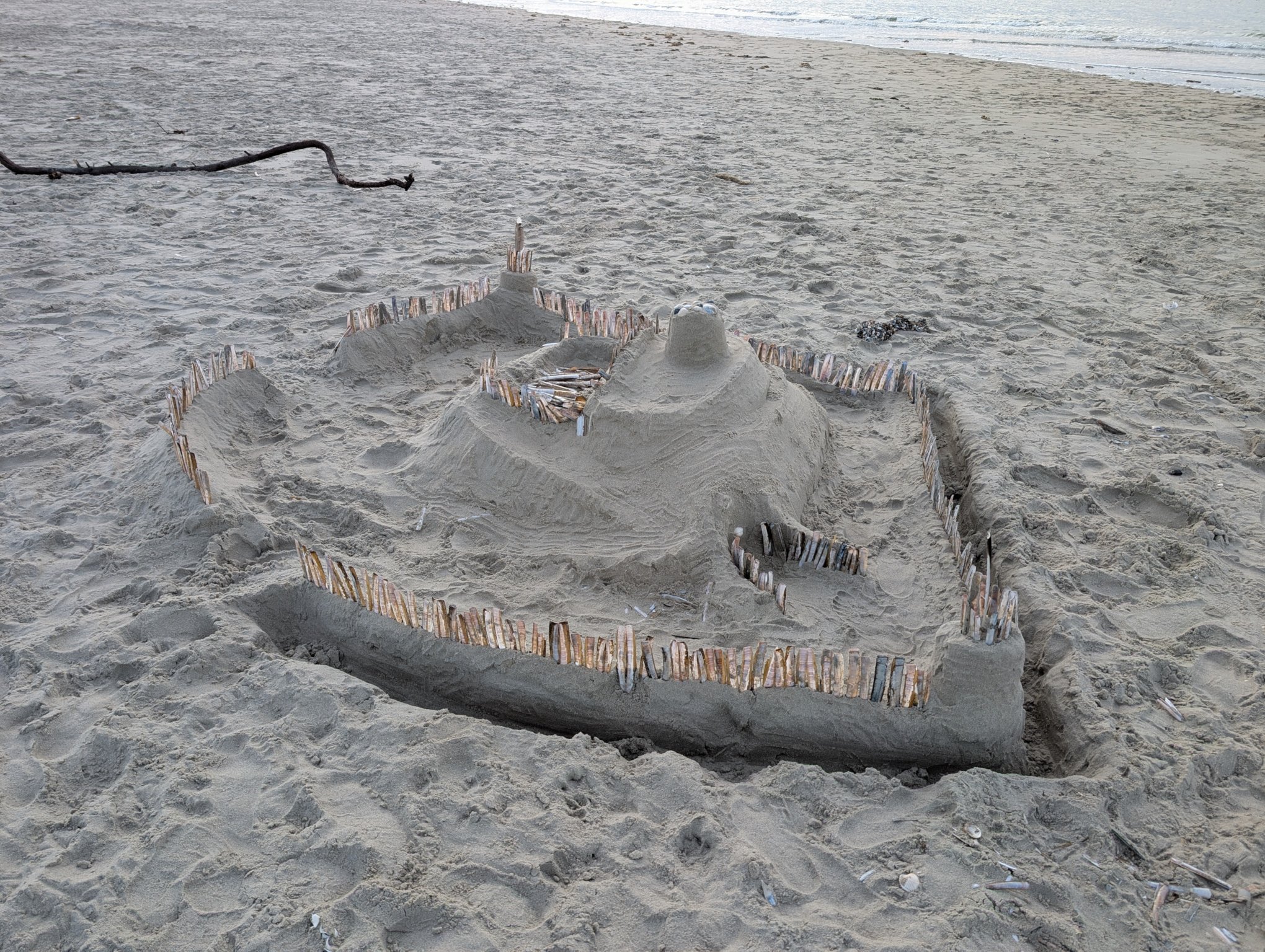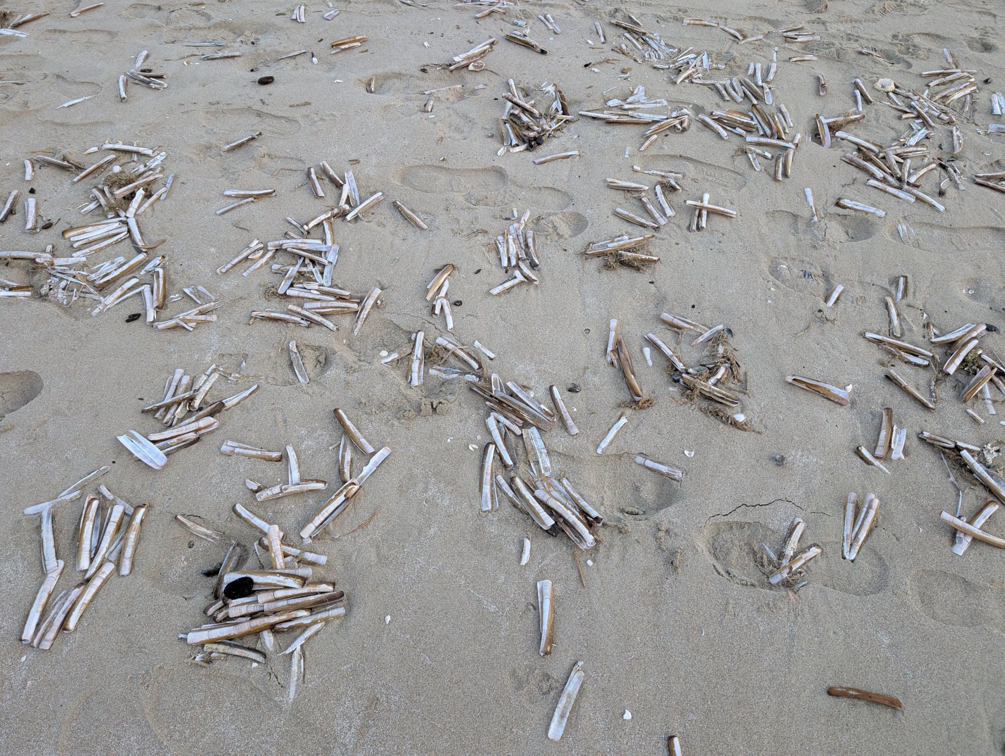 Vom Strand aus kann man den riesigen Rotterdamer Hafen sehen, der ist ja nicht weit. Am Strand ist - abgesehen von ein paar Gänsen und Möwen - nichts los. Aber es muss mal jemand dagewesen sein und eine schöne Sandburg gebaut haben. Muscheln findet man allerdings auch keine, außer den Schwertförmigen Scheidenmuscheln, die gibt es zu Hauf.