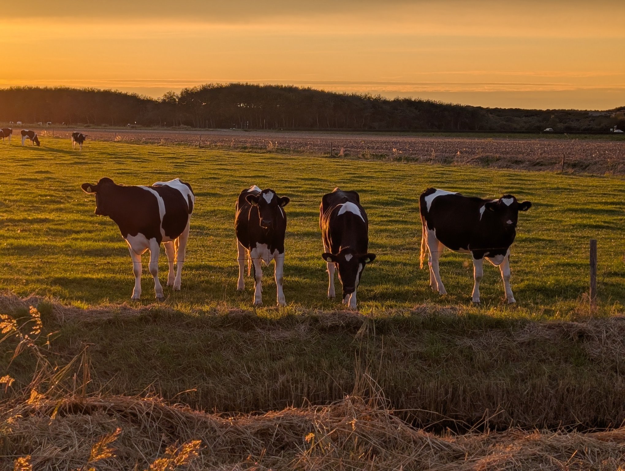 Die Sonne geht unter und malt schöne Farben auf den Himmel und alles, was darunter ist. Als wir an einer Kuhweide stehen, um den Sonnenuntergang zu knipsen, kommen vier Kühe angetrottet, um uns in Augenschein zu nehmen. Wir gehen weiter, bevor noch mehr kommen.