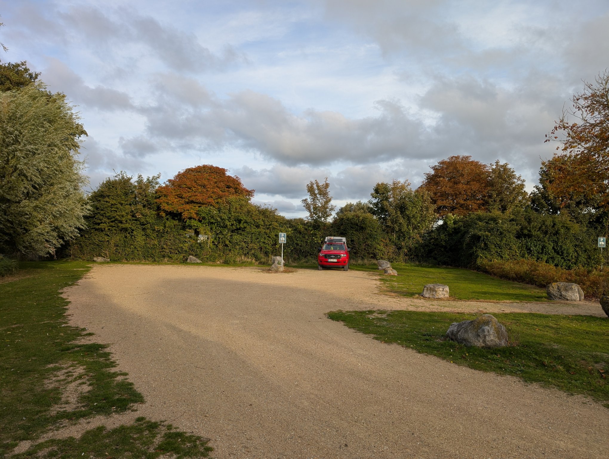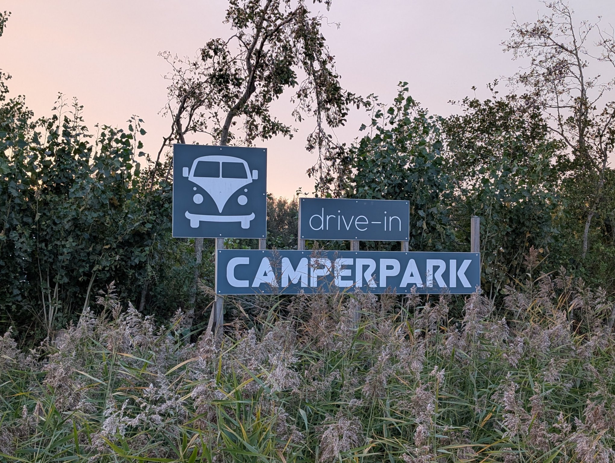 Die Werbung für den Park suggeriert Dank des stilisierten VW T1, dass es hier eher klein und gemütlich ist. Tatsächlich ist der Platz eher steril, gepflegter Rasen, ein paar maximal hüfthohe Sträucher. Und von uns abgesehen steht hier ausschließlich Weißware rum. Also eher ein Spießerplatz.