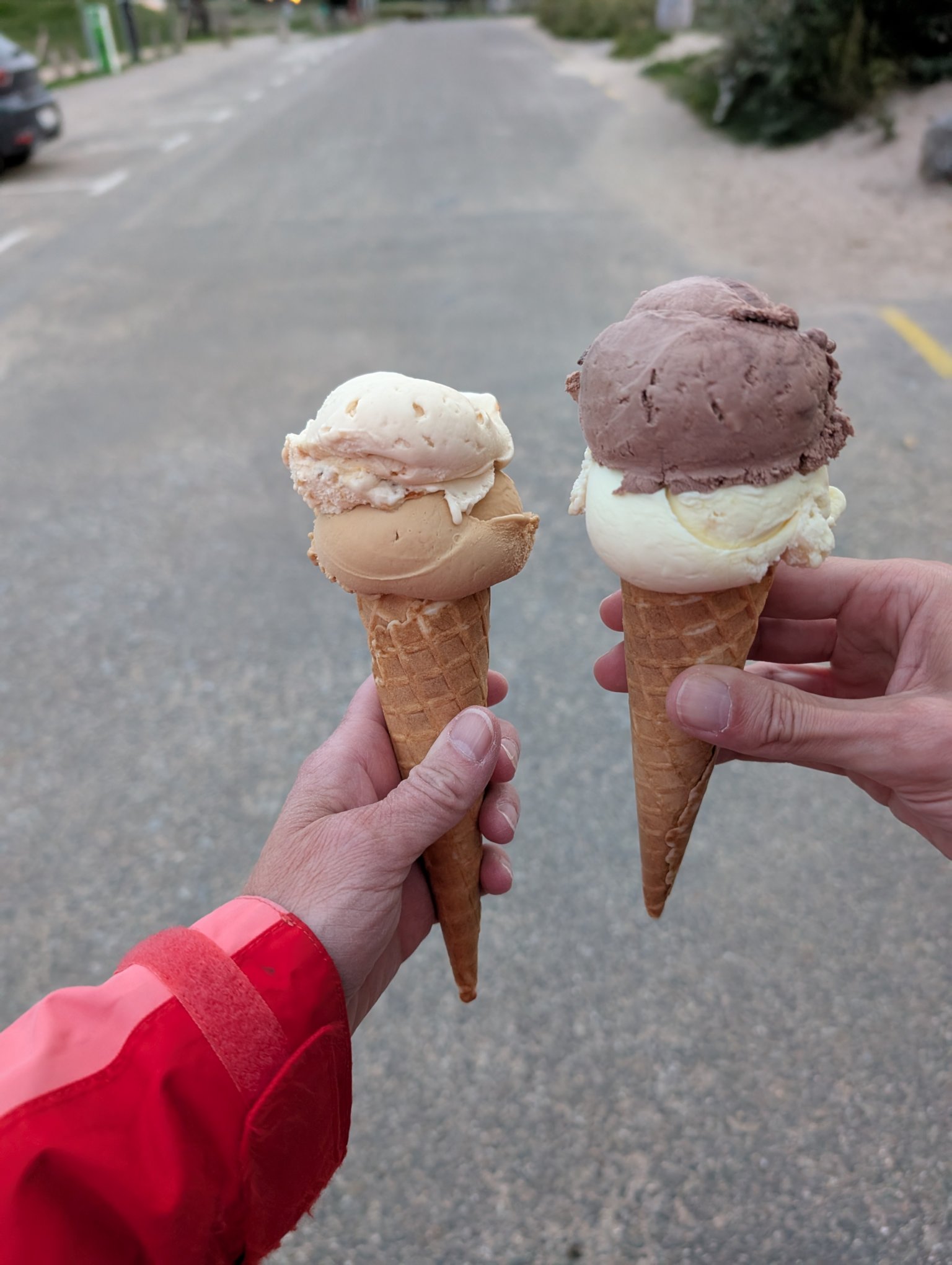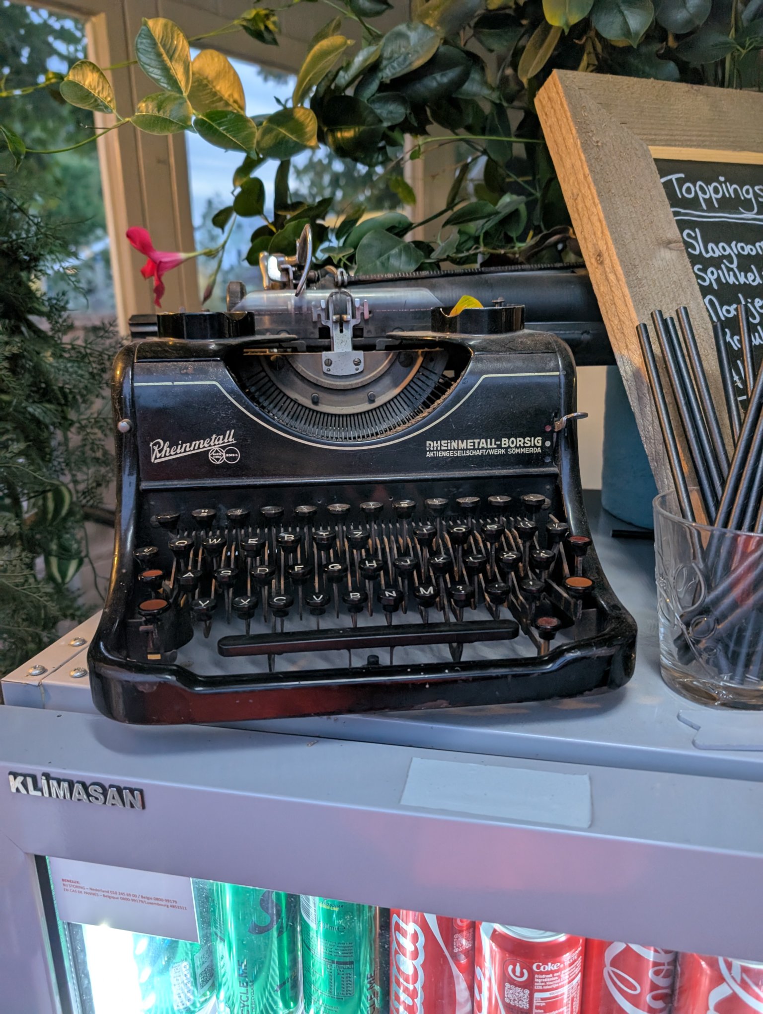 Wir gehen am Strand zurück bis zur Höhe unseres Stellplatzes. Dort ist, was wir vorher nicht wussten, ein Restaurant mit Außerhaus-Eisverkauf. Das lassen wir uns natürlich nicht entgehen, ich knipse die Deko und wir kaufen uns ein Eis.