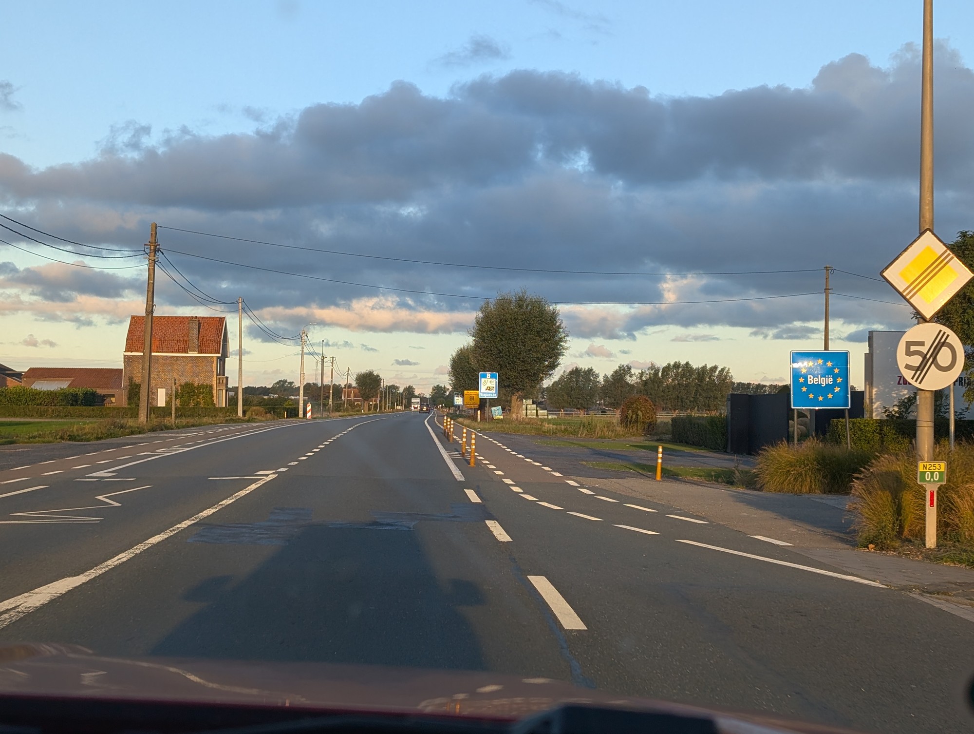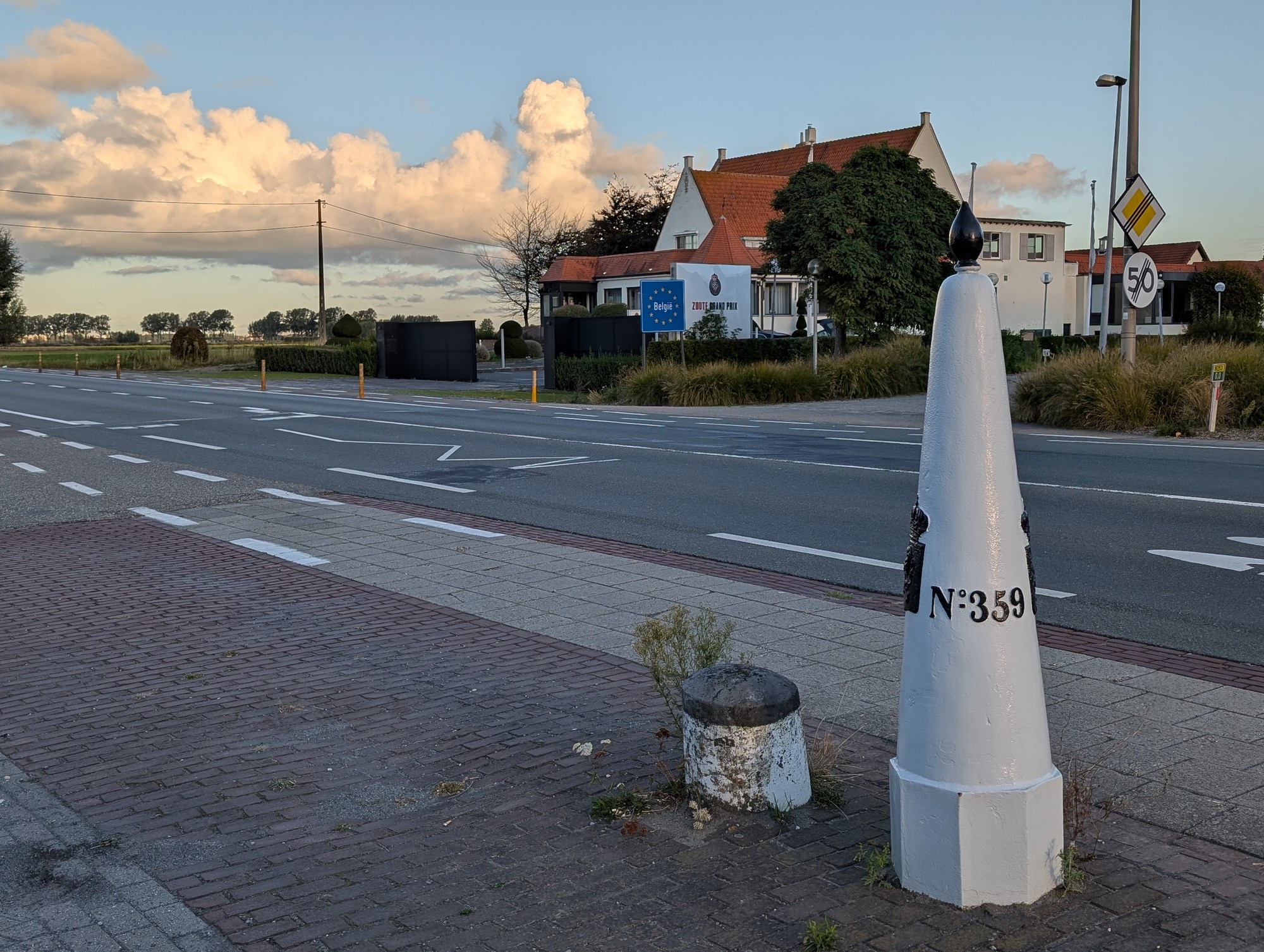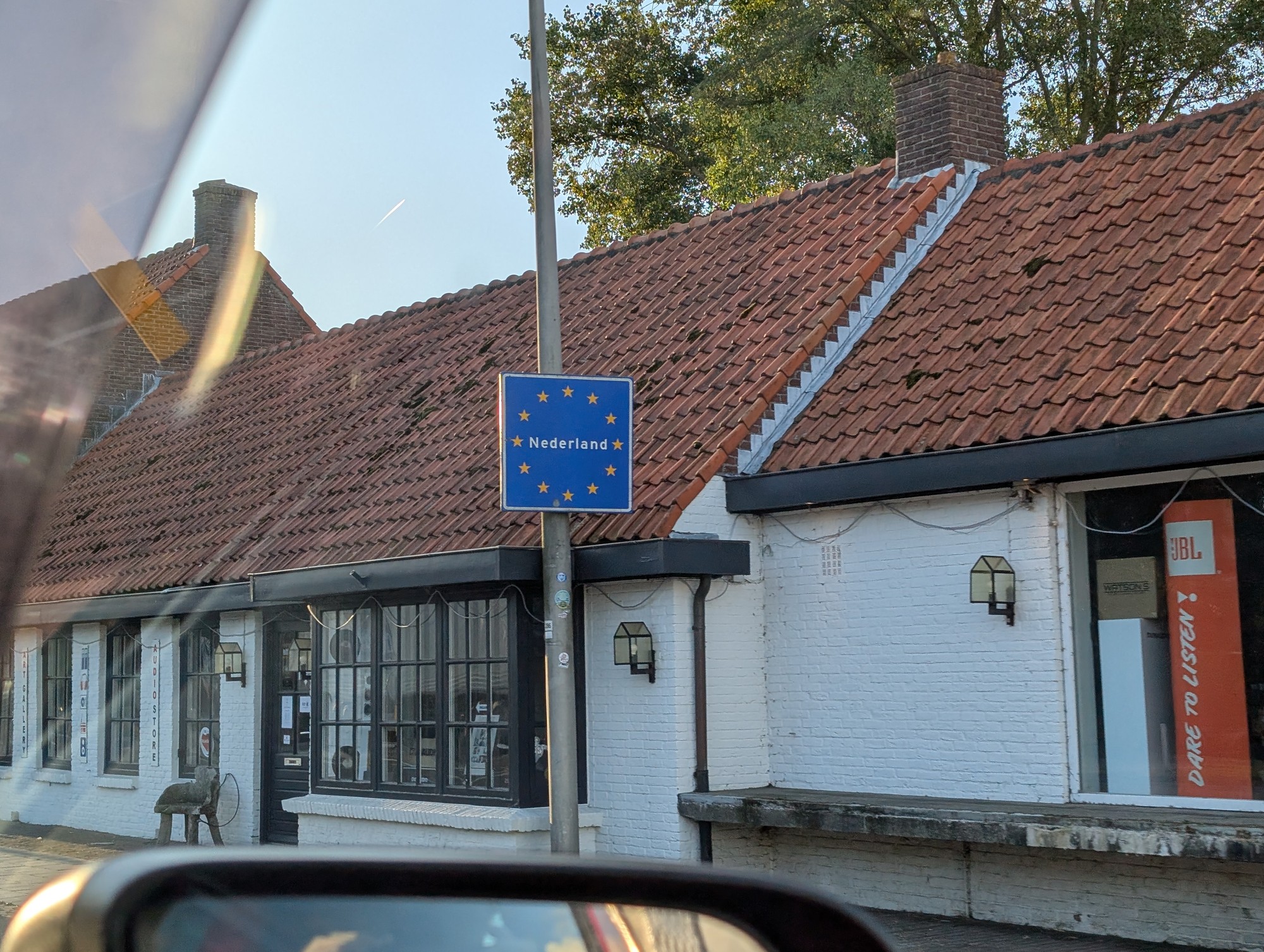 Der westlichste Punkt liegt nicht, wie manche vielleicht denken, irgendwo an der See. Ich dachte das bisher auch. Er liegt aber im Landesinneren, südlich von der Küste im Grenzort Sint Anna ter Muiden. Wenn man es ganz genau nimmt und den Karten-Apps trauen kann, liegt er in einem Gebäude am Straßenrand. Da wir aber nicht dort klingeln und fragen wollten, ob wir mal knipsen dürfen, haben wir uns mit den Grenzschildern und dem Grenzstein begnügt.