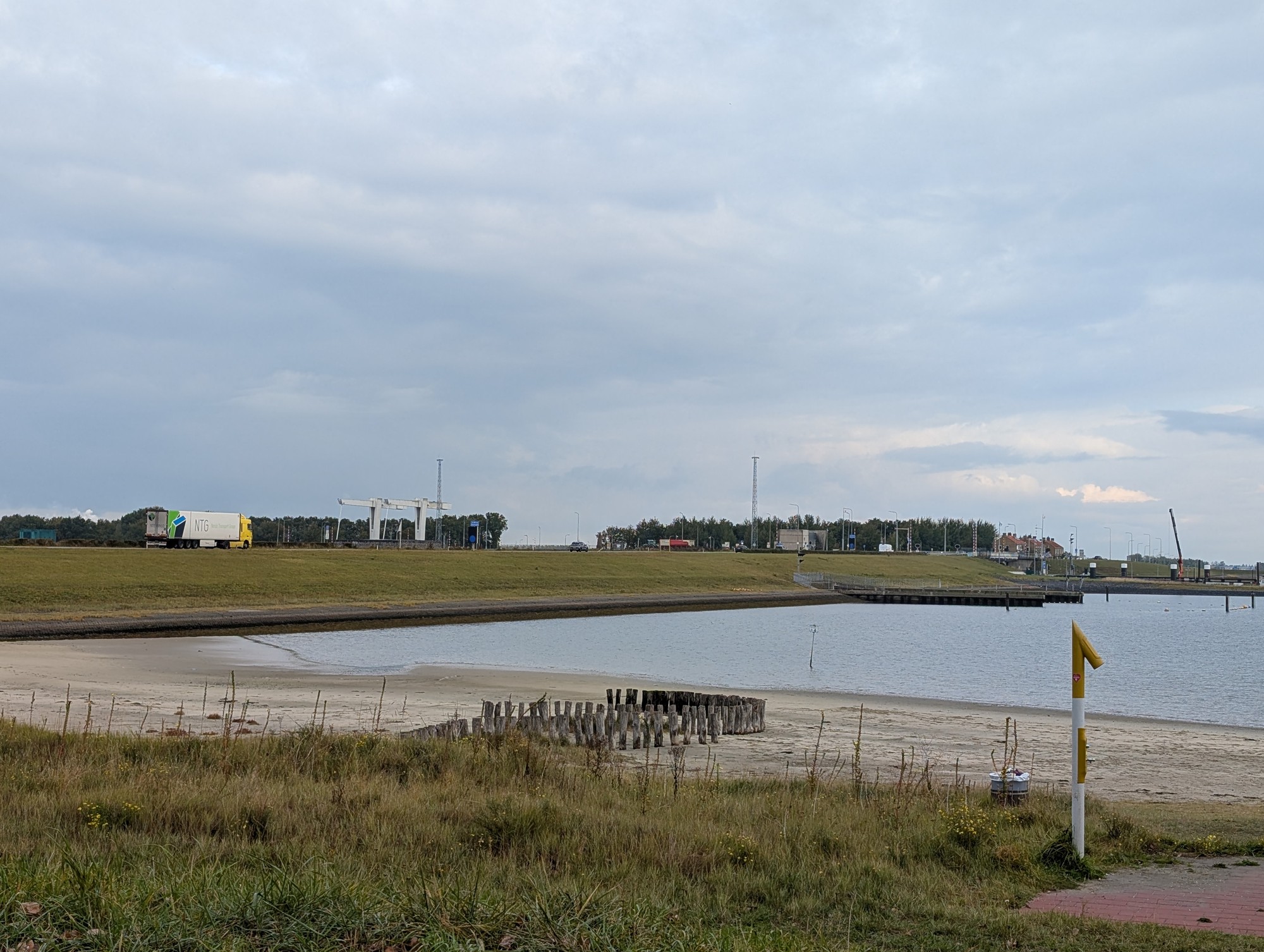 Dann fahren wir auf den Damm. Der ist schnurgerade durchs Wasser gezogen. Links von uns fahren Schiffe zwischen den beiden Dämmen auf der Wasserstraße, die Schelde-Rijnkanaal heißt.