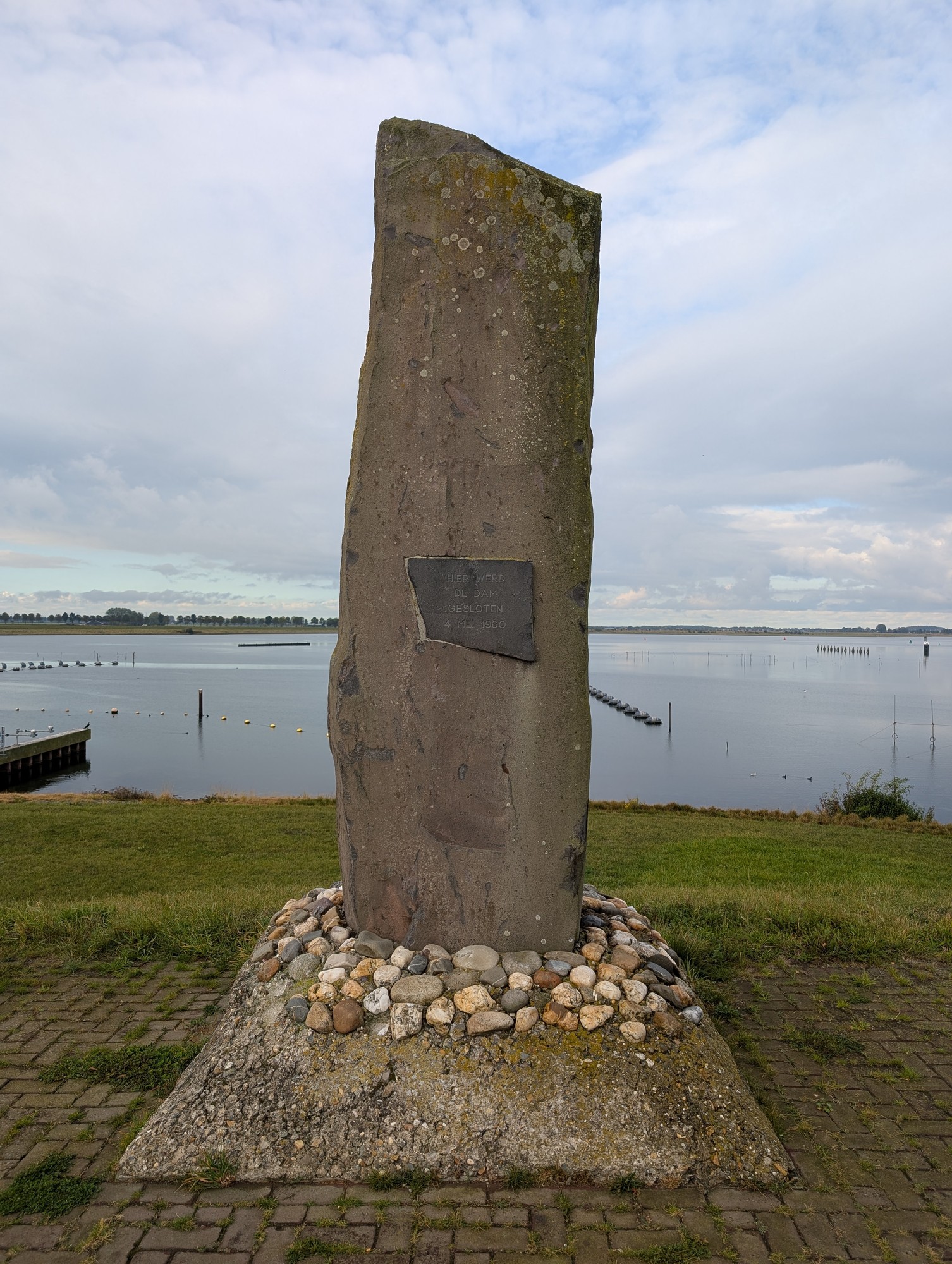 Vor dem Damm ist ein kleiner Badestrand, an dem wir zunächst Halt machen für ein paar Photos. Hier steht auch ein Gedenkstein zum Dammabschluss.
