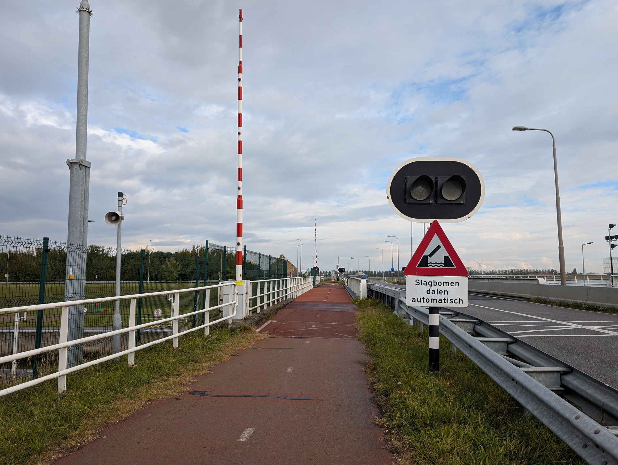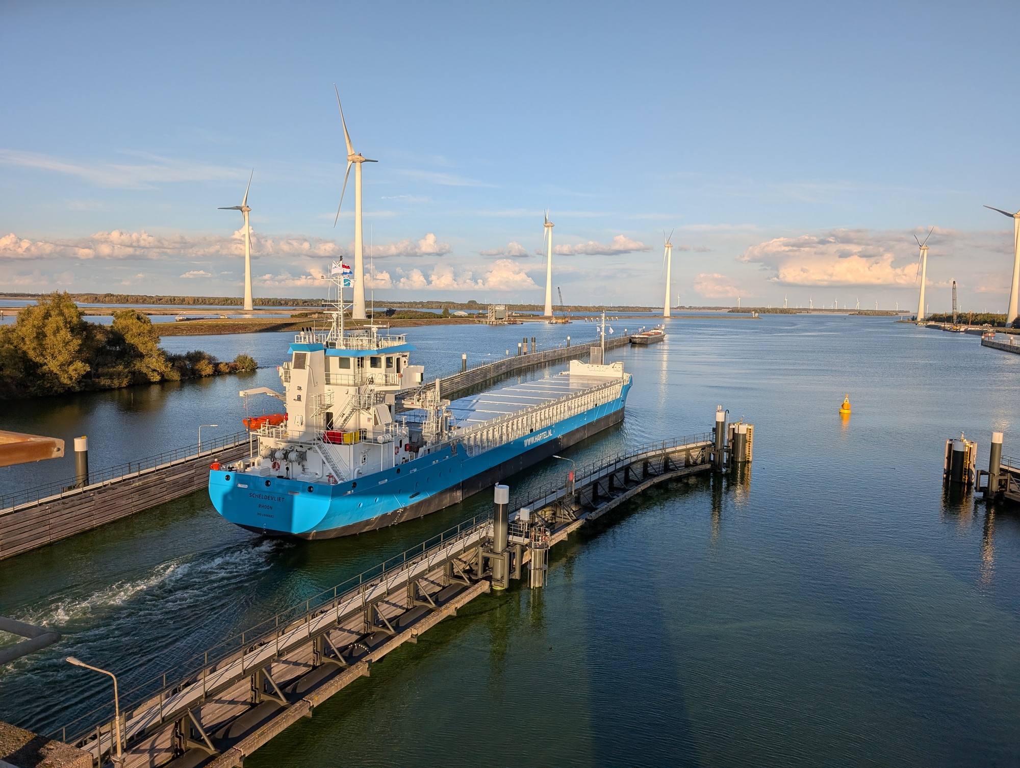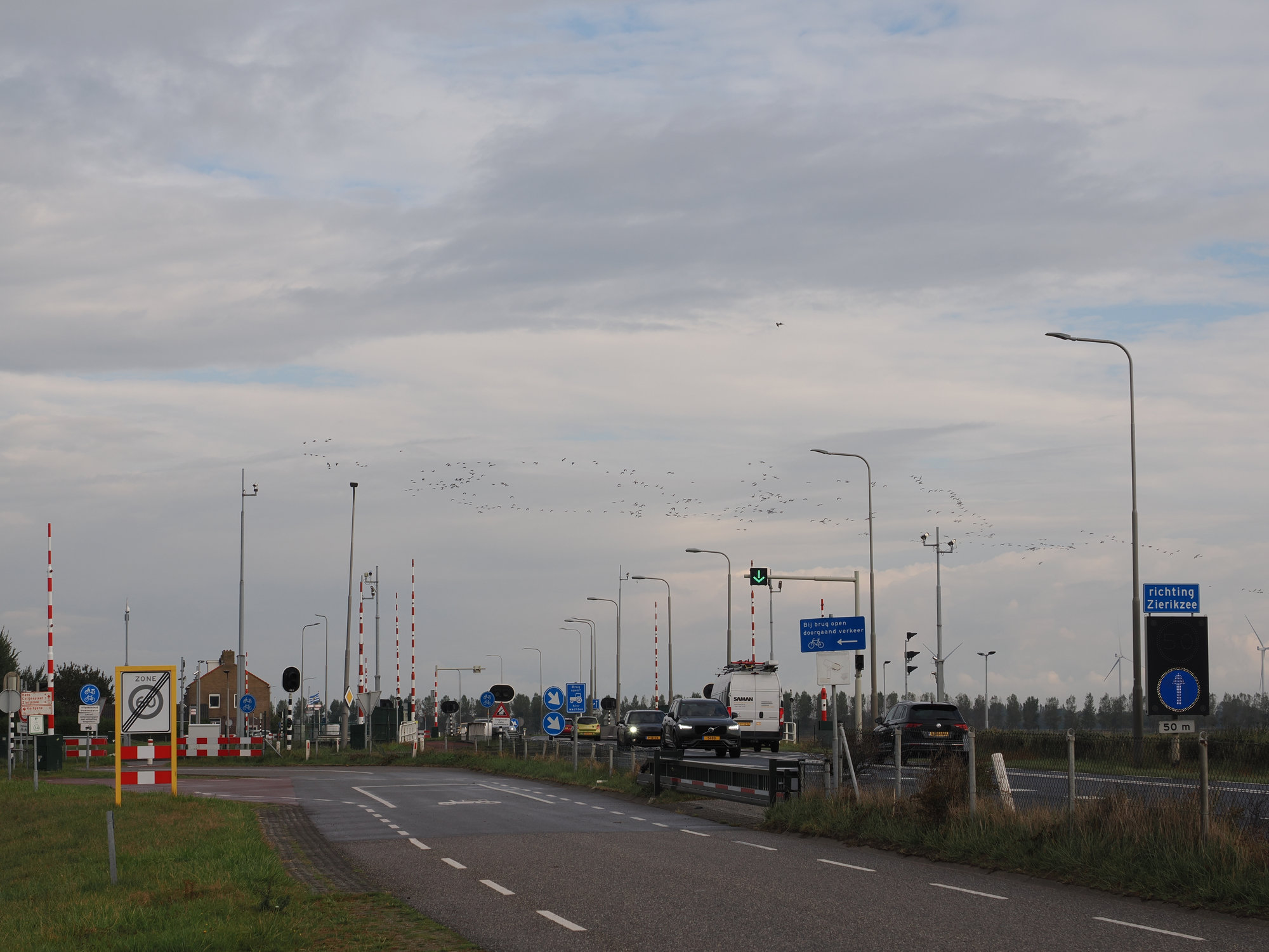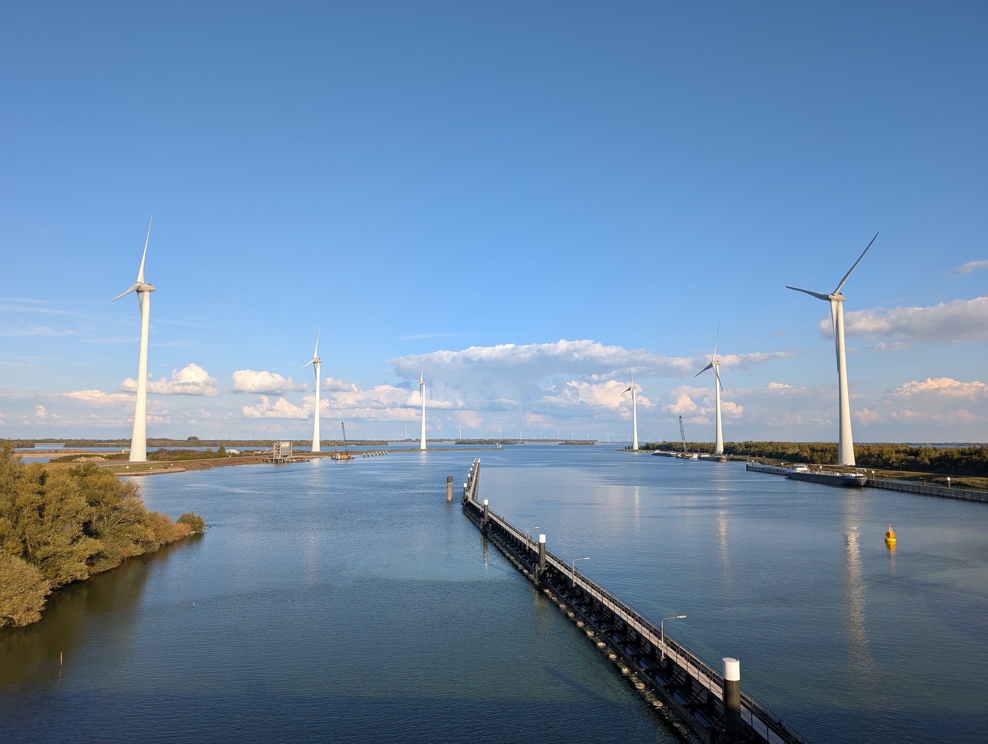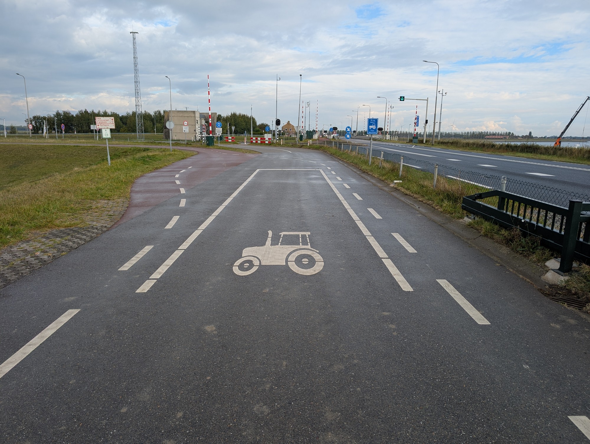 Die Wasserstraße teilt sich am Ende des Oesterdams, ein Teil bleibt der Schelde-Rhein-Kanal mit dem Sperrwerk oben im Bild. Der fließt weiter in den Hafen von Antwerpen. Der andere Teil der Wasserstraße wird der Bathse Spuikanaal. Der dient zur Entwässerung und fließt in die Westerschelde. Und damit das geordnet abläuft (pun intended), ist am Ende noch die Bathse spuisluis gebaut worden. Das alles ist Teil der Deltawerke, weswegen wir hier überhaupt rumfahren.