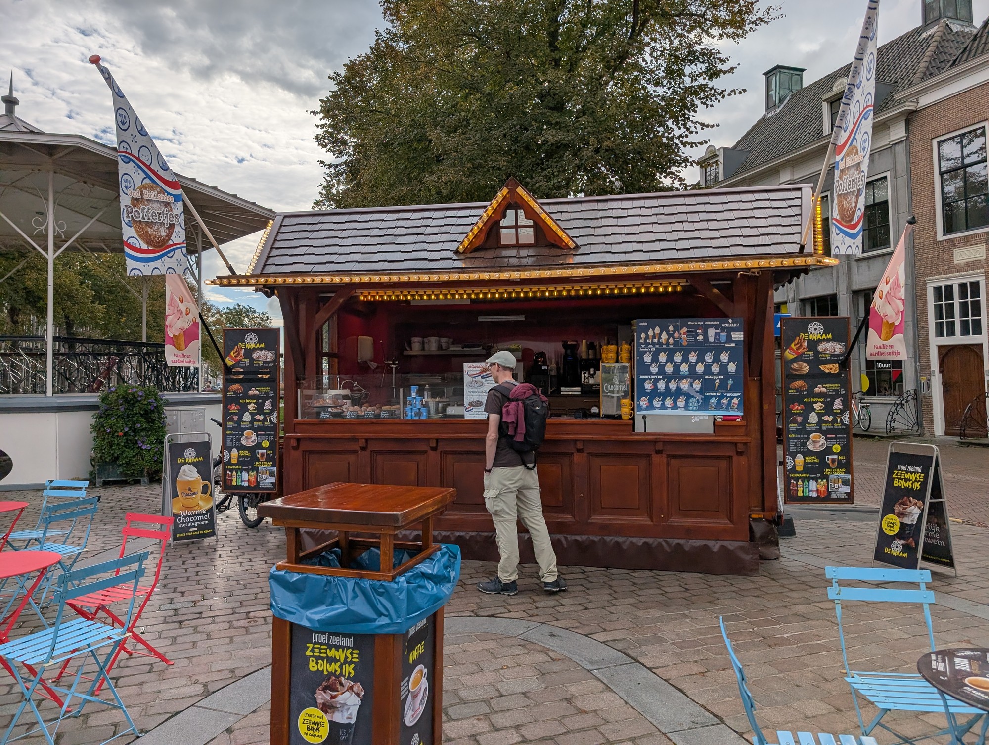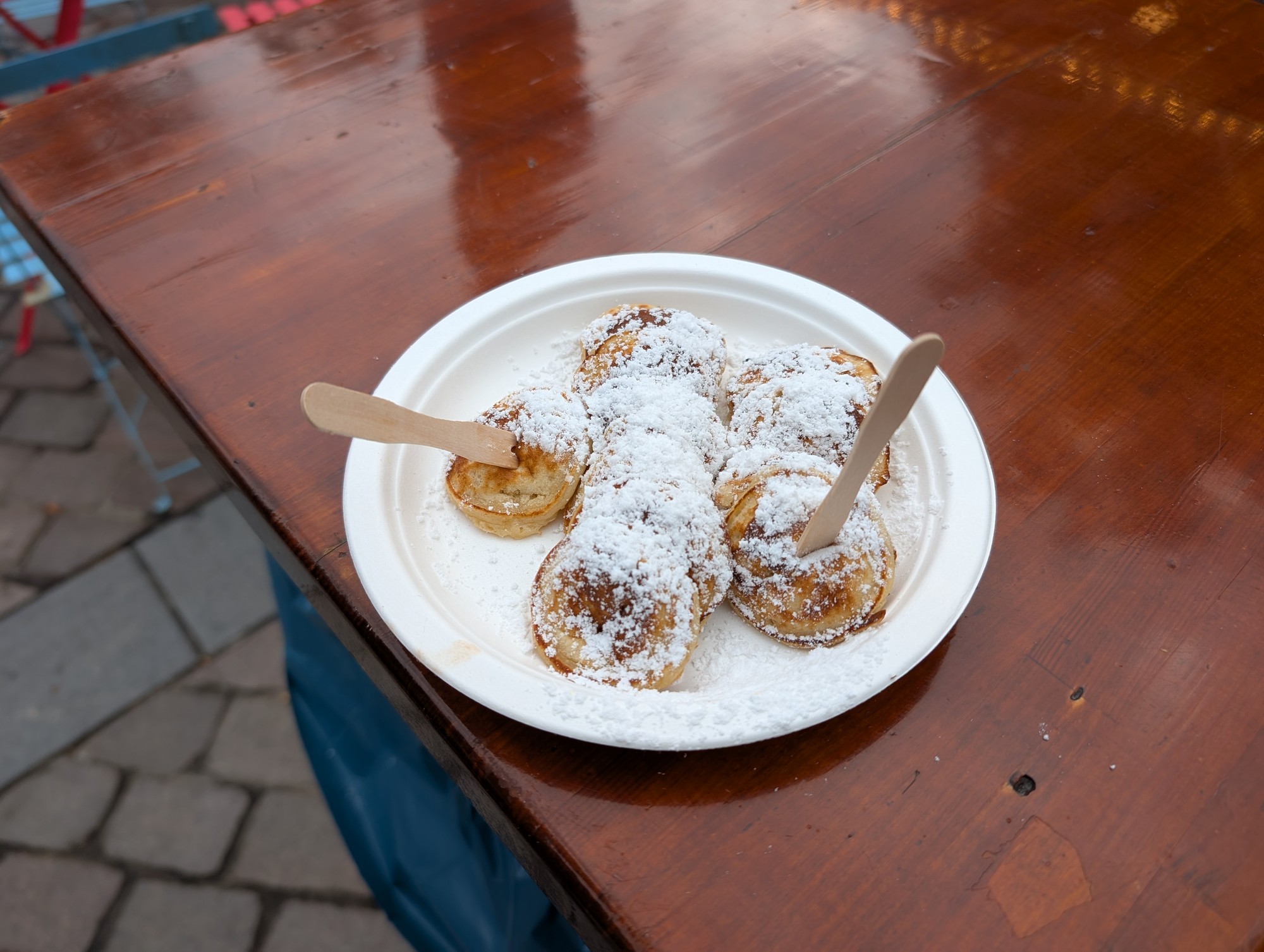 Auf dem Marktplatz gibt es gerade nur einen einzigen Stand, aber der ist für uns genau das Richtige. Bisher hatten wir noch keine Gelegenheit, Poffertjes zu essen. Das muss dringend nachgeholt werden und zwar jetzt!
