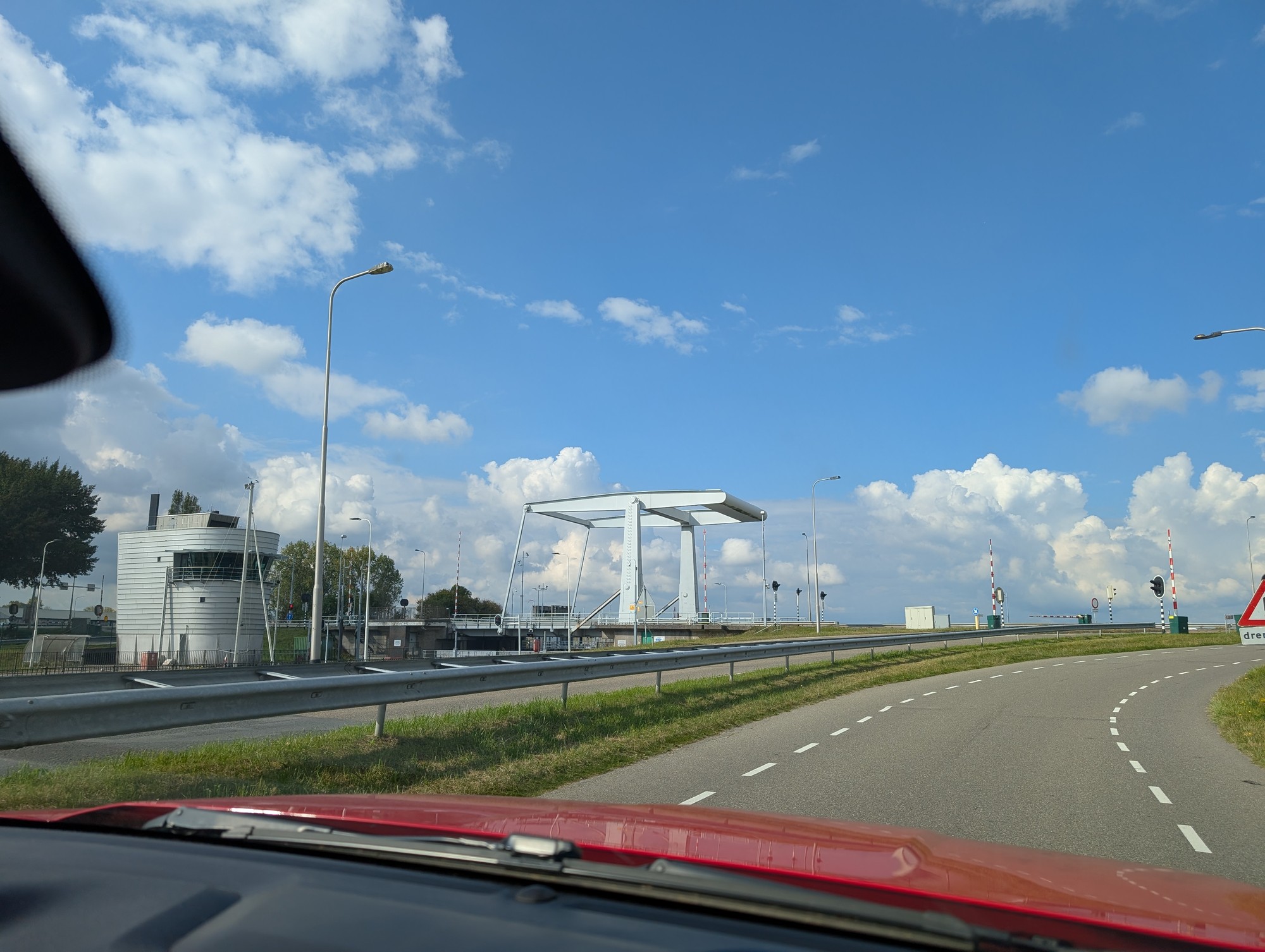 Während wir rauf gehen, öffnet sich gerade die Klappbrücke und ein Schiff mit einem Kran fährt durch. Und der kleine Stell- und Parkplatz lässt sich von oben auch gut überblicken.