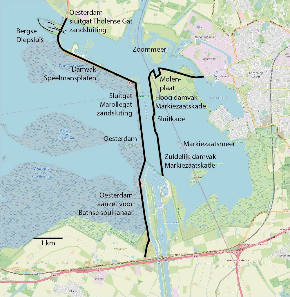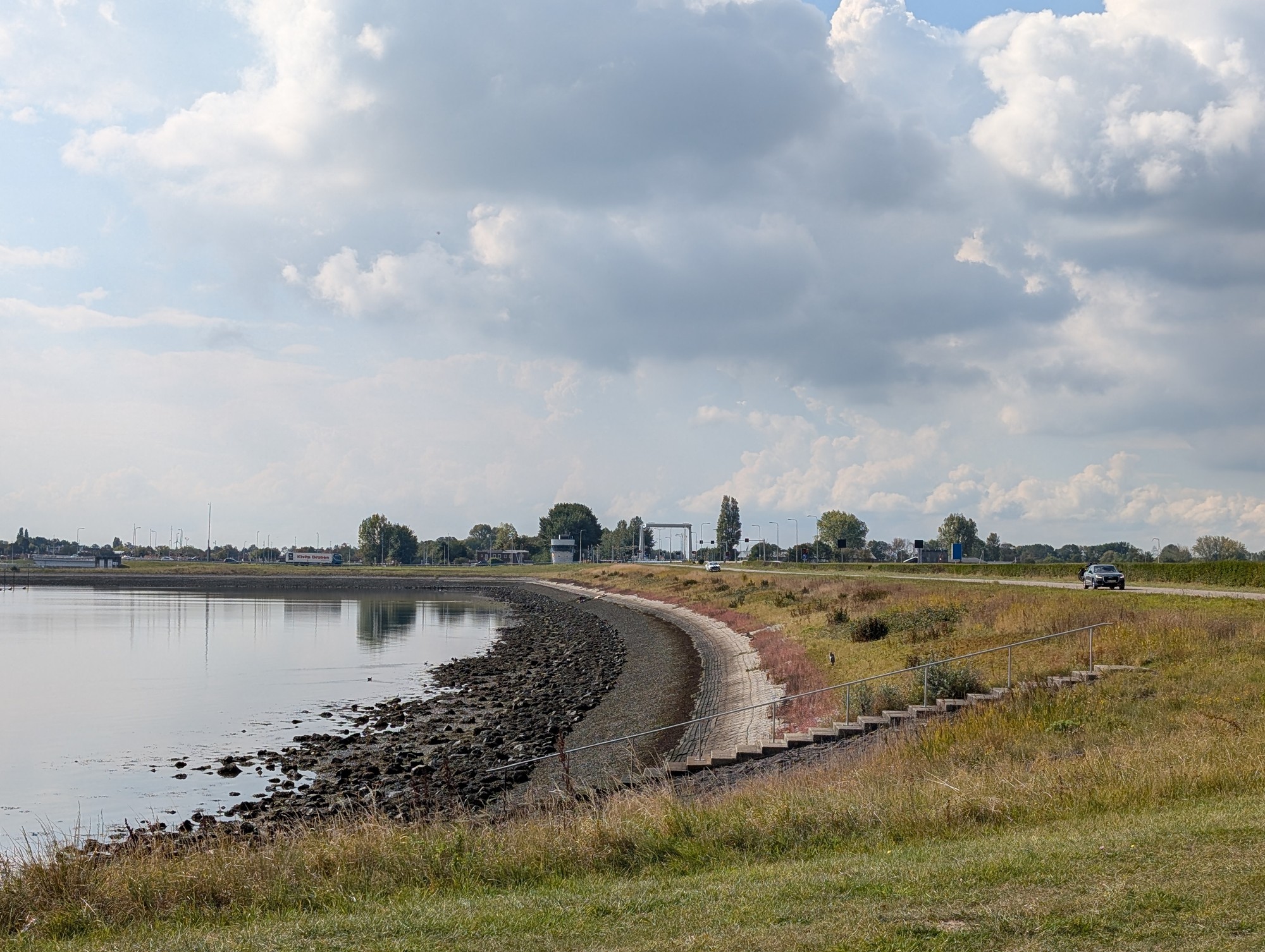 Es gibt zwei Dämme, den großen Oesterdam, der über 10 km lang ist und auf dem eine Schnellstraße verläuft. Und daneben, weiter im Landesinneren die gut vier km lange Markiezaatskade, die Bergen op Zoom vor zuviel Wasser schützt. Dazwischen ist eine Binnenwasserstraße, auf der Schiffe unterwegs sind.