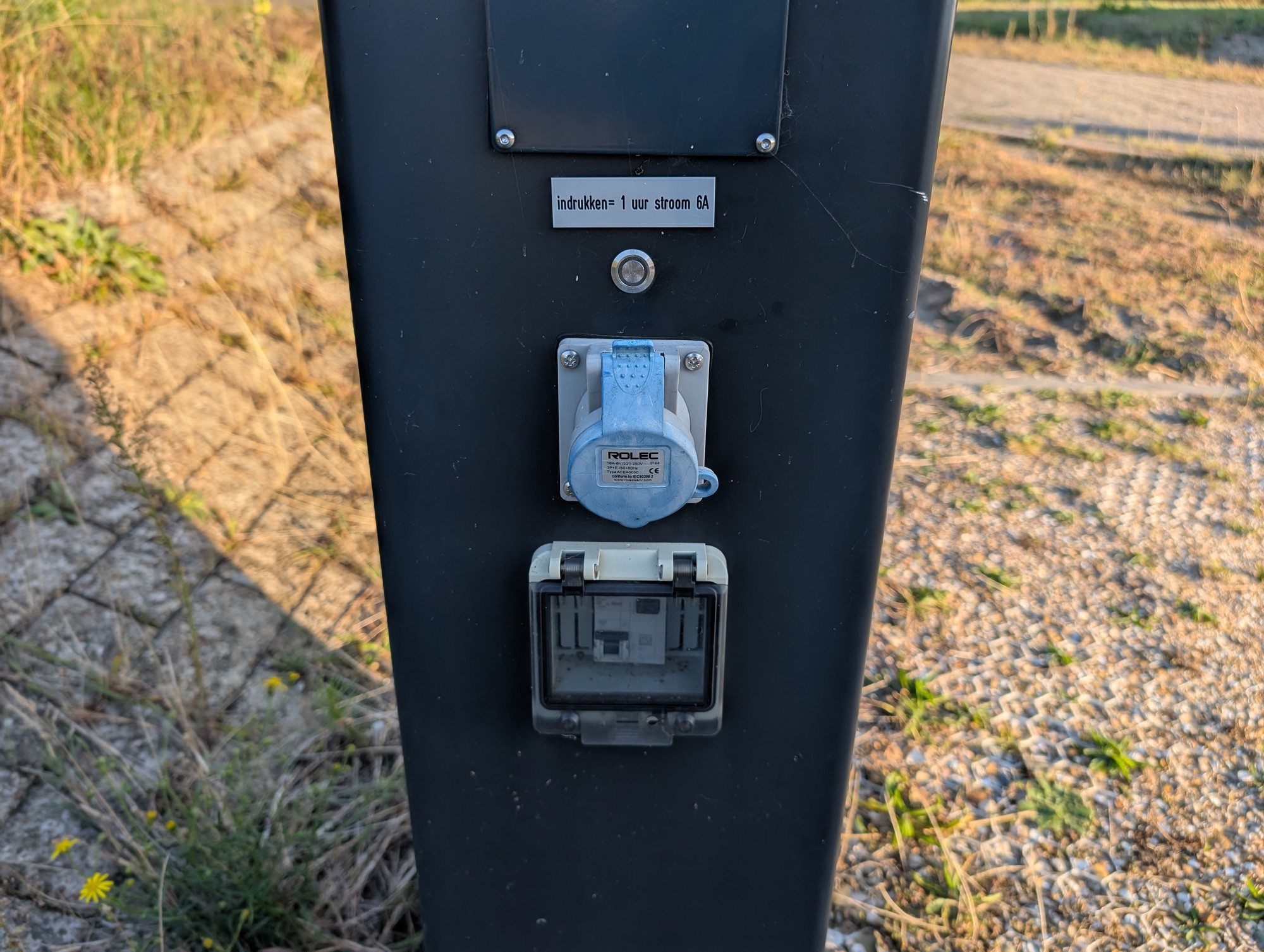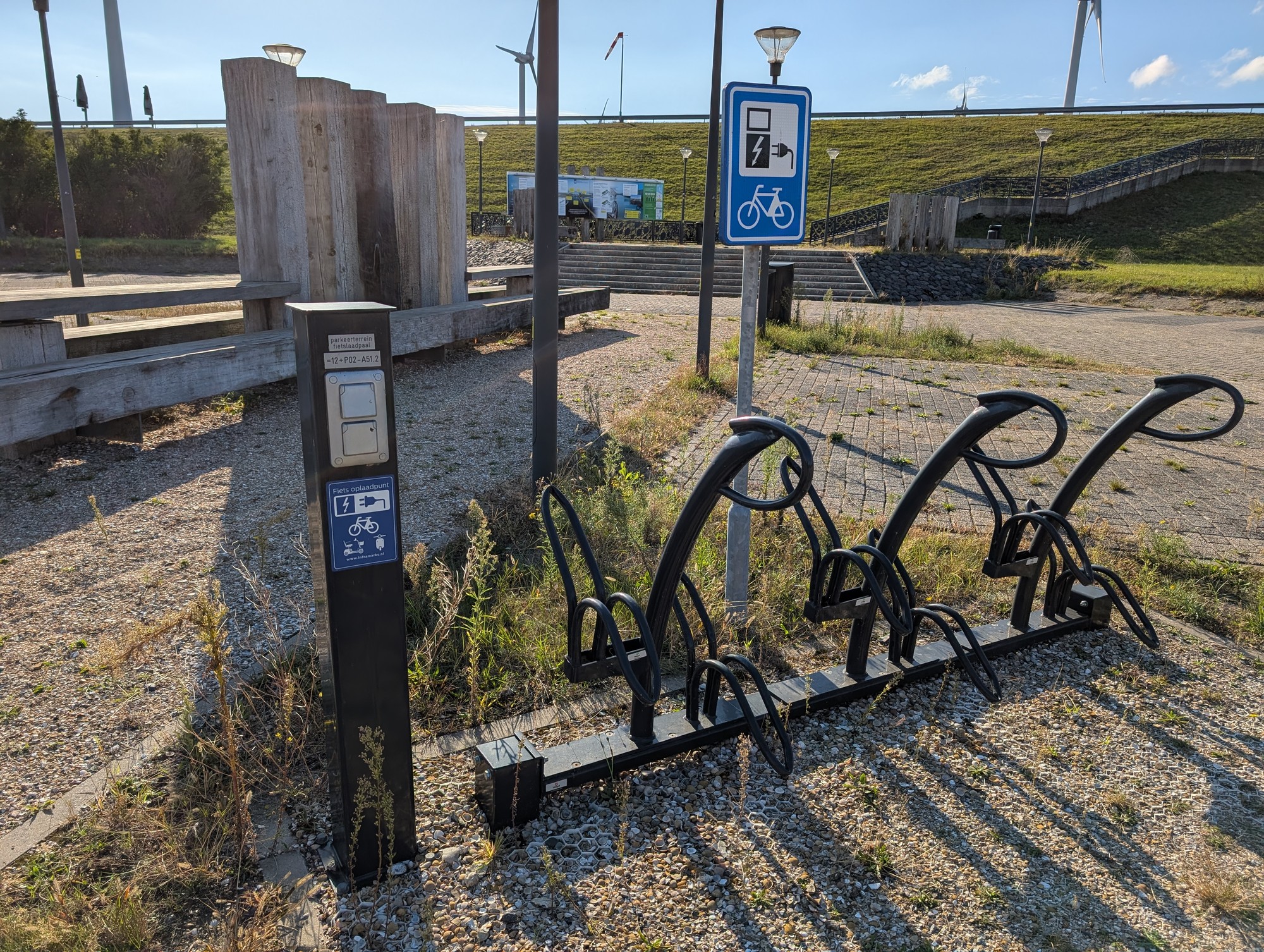 Auf dem Stellplatz gibt es natürlich einen Fahrradstellplatz. Dort kann man kostenlos sein Fahrrad aufladen, sofern man ein E-Bike hat. Außerdem gibt es für einmal Knopfdrücken eine Stunde Strom gratis im Camper. Wenn man mehr Strom benötigt, ist das vielleicht etwas lästig, aber es ist hier eben komplett kostenlos.