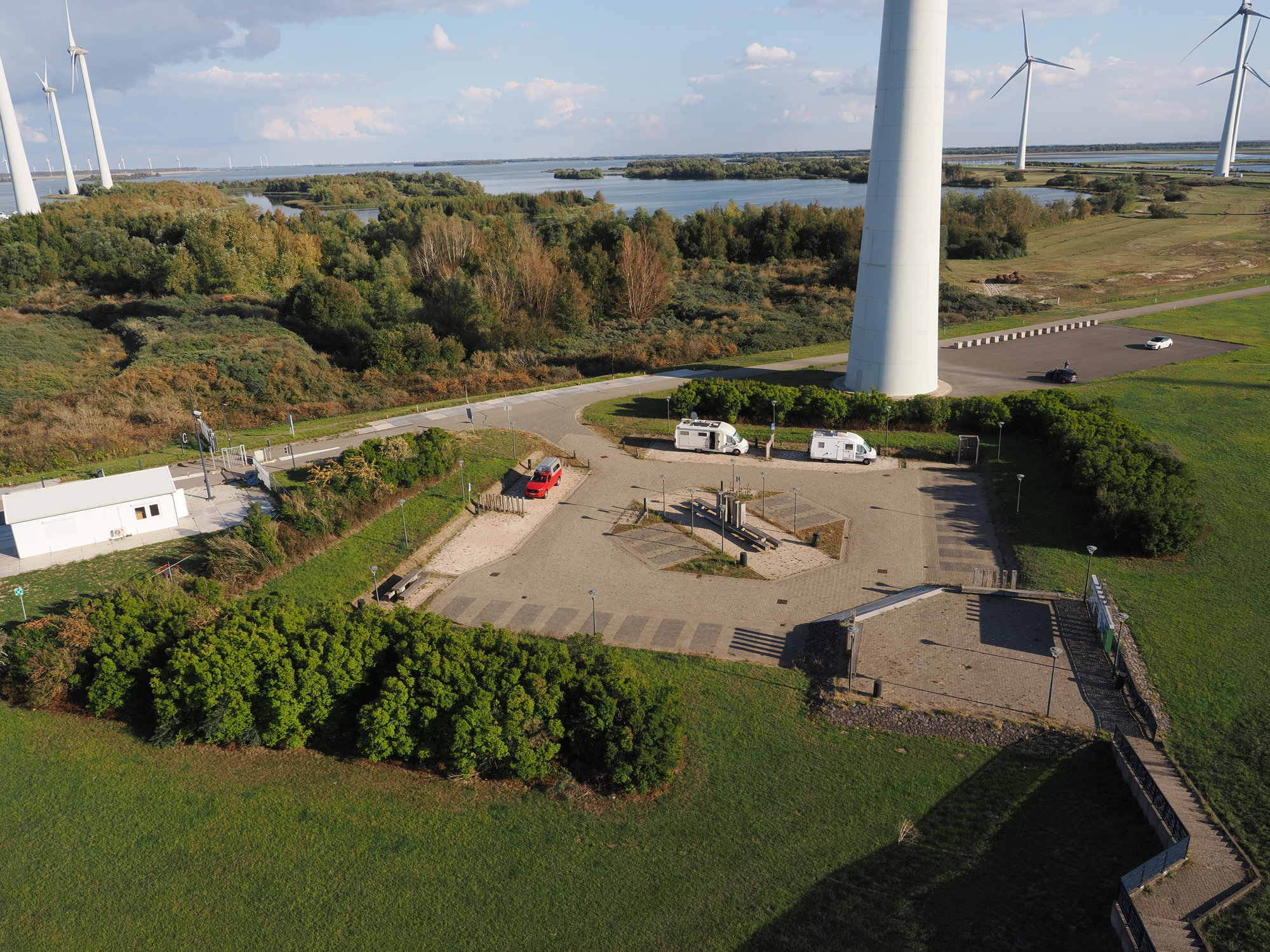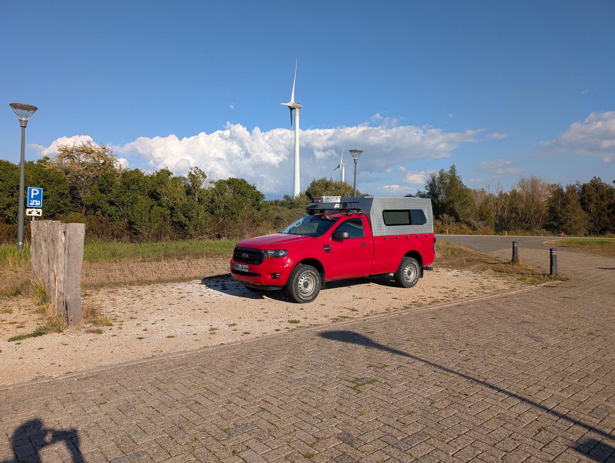 Auf dem Philipsdam ist auch ein kleiner Wohnmobilstellplatz mit Platz für vier Fahrzeuge. Hier wollen wir übernachten. Zunächst hatte ich etwas Bedenken wegen der Windräder, die können nämlich ganz schön unangenehm laut sein. Aber es geht nicht so sehr viel Wind und dieser trägt vor allem den Schall von uns weg.