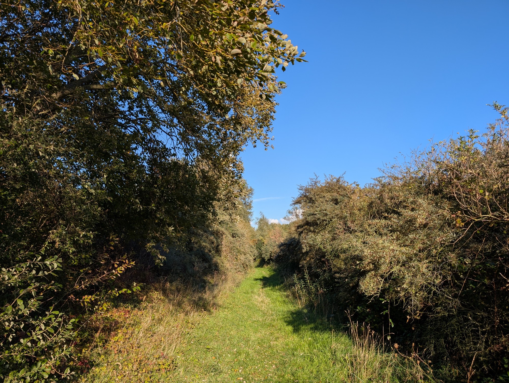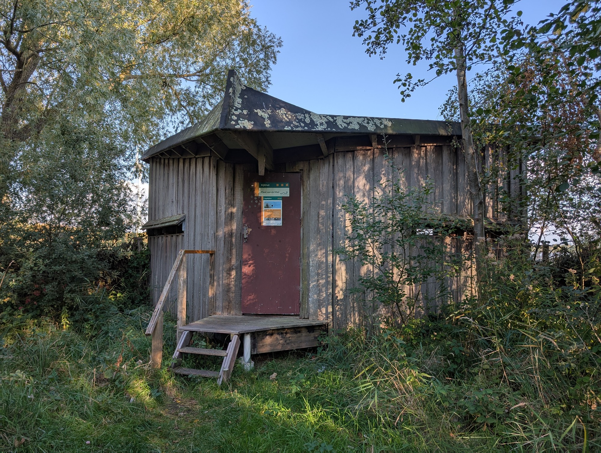 Anschließend laufen wir erst ein Stück durchs Grün. Weit kommt man aber leider nicht und bedauerlicherweise gibt es auch keinen schönen Rundgang. Eine Vogelbeobachtungshütte gibt es, aber da sind zurzeit nur Spinnen zu sehen. Also laufen wir zurück und ich will nochmal auf die Brücke und Schleuse gucken. Und ich habe Glück, nach einigem Warten will tatsächlich ein Schiff durch die Schleuse.