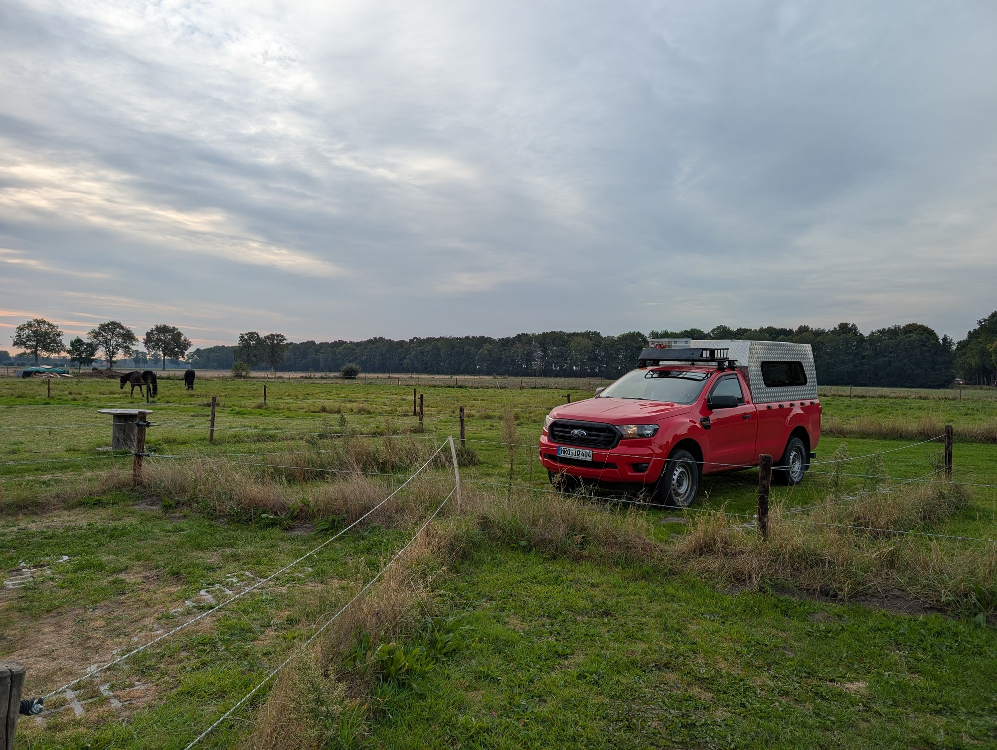 Unser Stellplatz ist auf einer Wiese neben einer Pferdeweide. Besser geht’s kaum. Endlich Füße hochlegen und den Abend ruhig ausklingen lassen. Morgen ist wieder ein Stadtrundgang geplant.