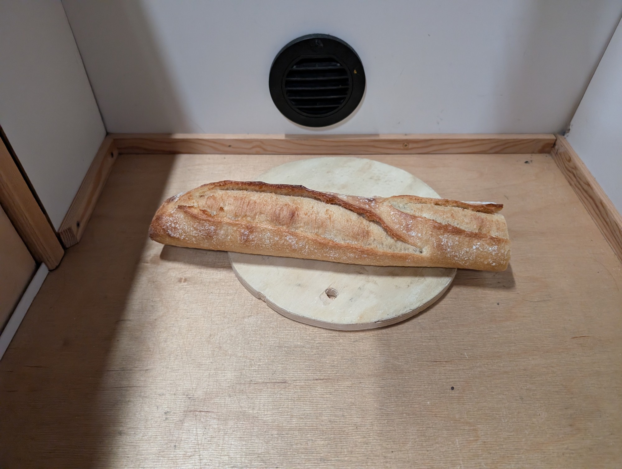 Mit Hilfe der Heizung backen wir die zweite Hälfte des Baguettes vom Vortag auf. Anschließend schmeckt es wieder vorzüglich.