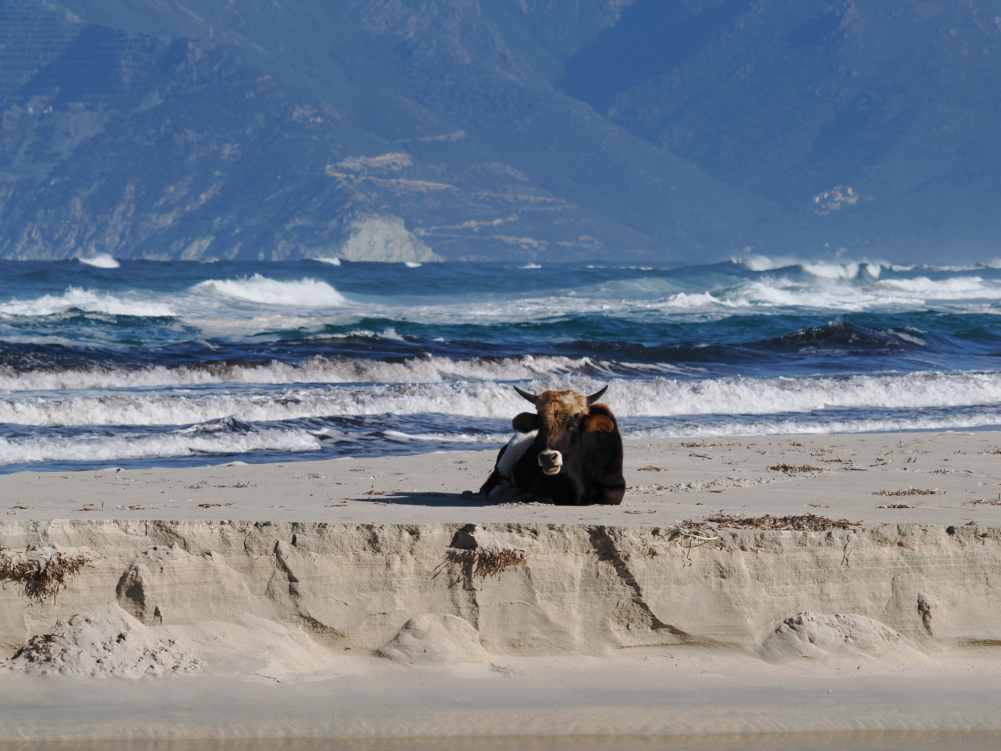 Auch auf dem Parkplatz tummeln sich Kühe. In Vorbereitung auf die Reise habe ich mehrfach gelesen, dass hier so viele Schweine frei herumlaufen sollen. Bisher haben wir allerdings nur ein paar Ziegen und zahlreiche Kühe gesehen.