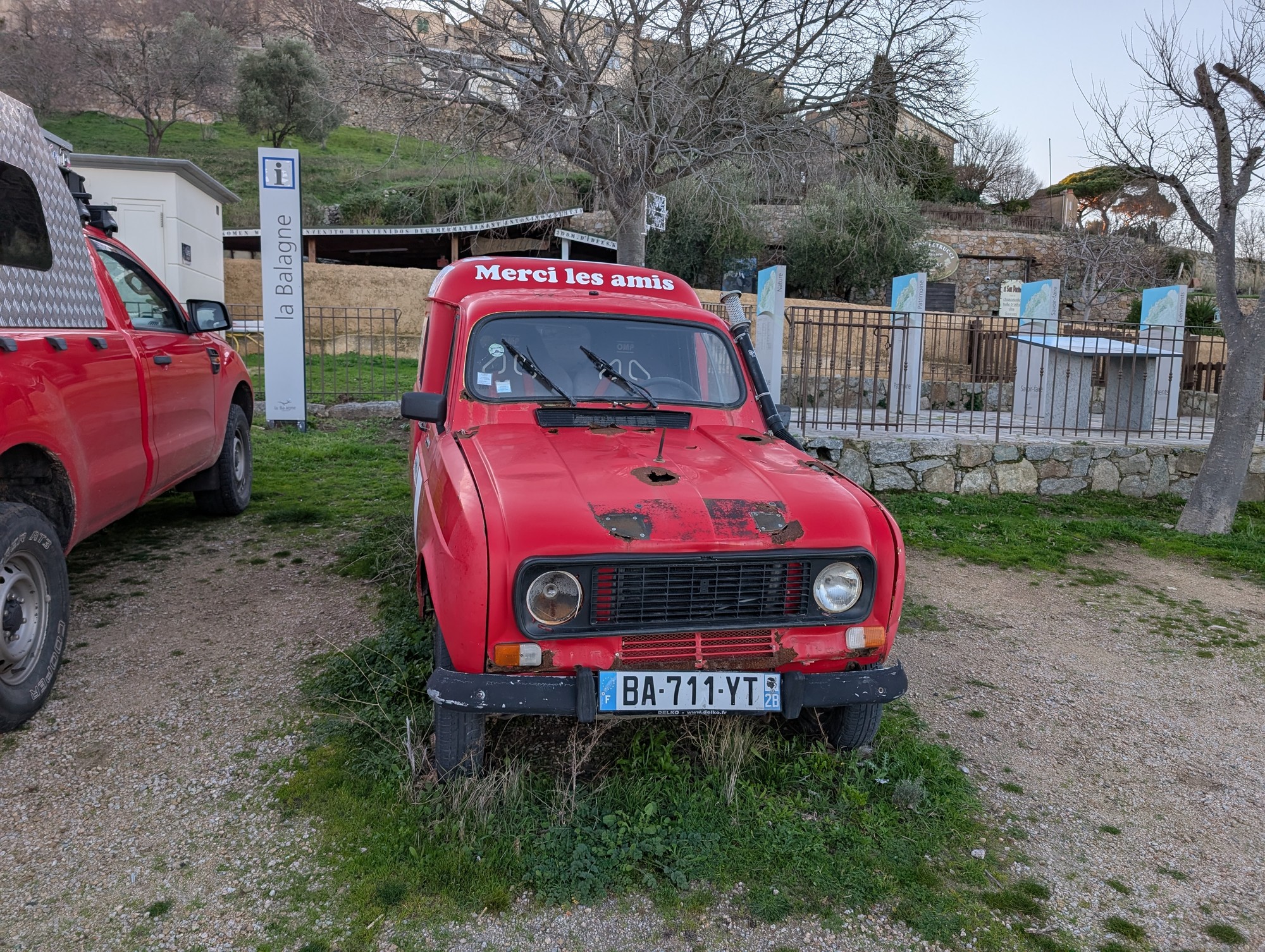 Eine halbe Stunde etwa sind wir in dem Ort herumgelaufen und er hat uns ziemlich gut gefallen. Aber da die Sonne bald untergeht, wollen wir uns auf den Weg zum Stellplatz machen. Auf dem Parkplatz steht neben uns ein alter R4, den wohl jemand dort entsorgt hat.