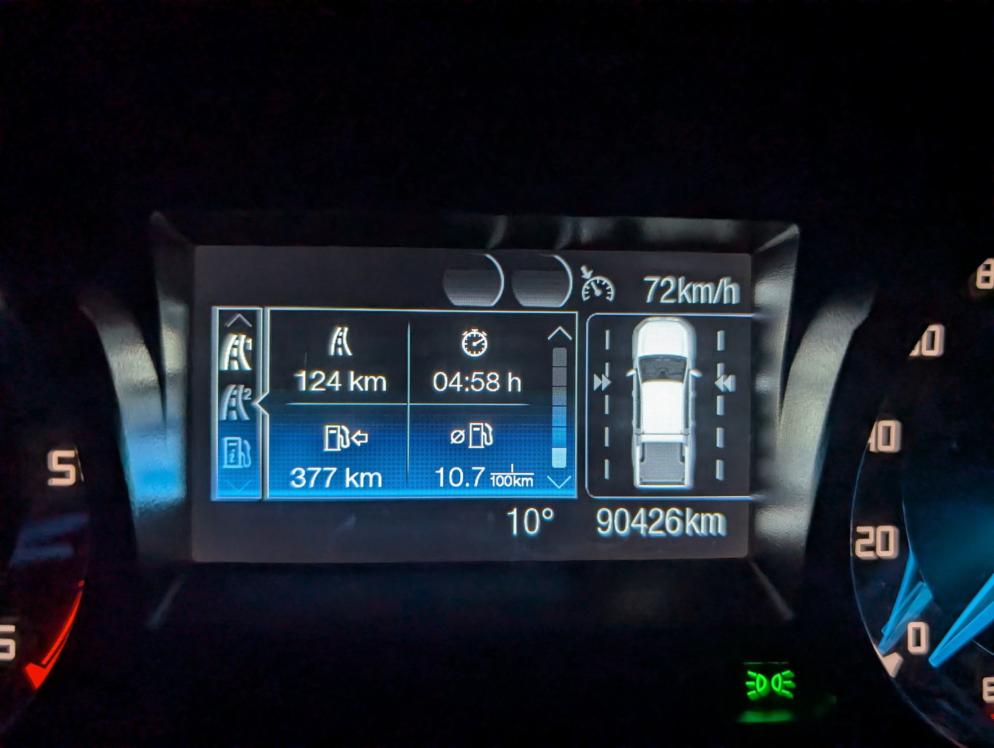Das steilste Stück ist am Anfang bzw. für uns jetzt am Ende der Strecke. Meine Wasserwaagen-App misst 13 Grad Steigung. Ein wenig muss man davon noch abziehen, weil im Auto ja praktisch nichts gerade ist. Das müssten etwa 17 bis 18 % Steigung sein. Laut Plakat an der Einfahrt sind es 10 %. Das halten wir für etwas tief gegriffen. Außerdem zieht sich die Strecke, ein wenig Power braucht das Auto da definitiv, um herauf zu kommen, obwohl dort asphaltiert ist.