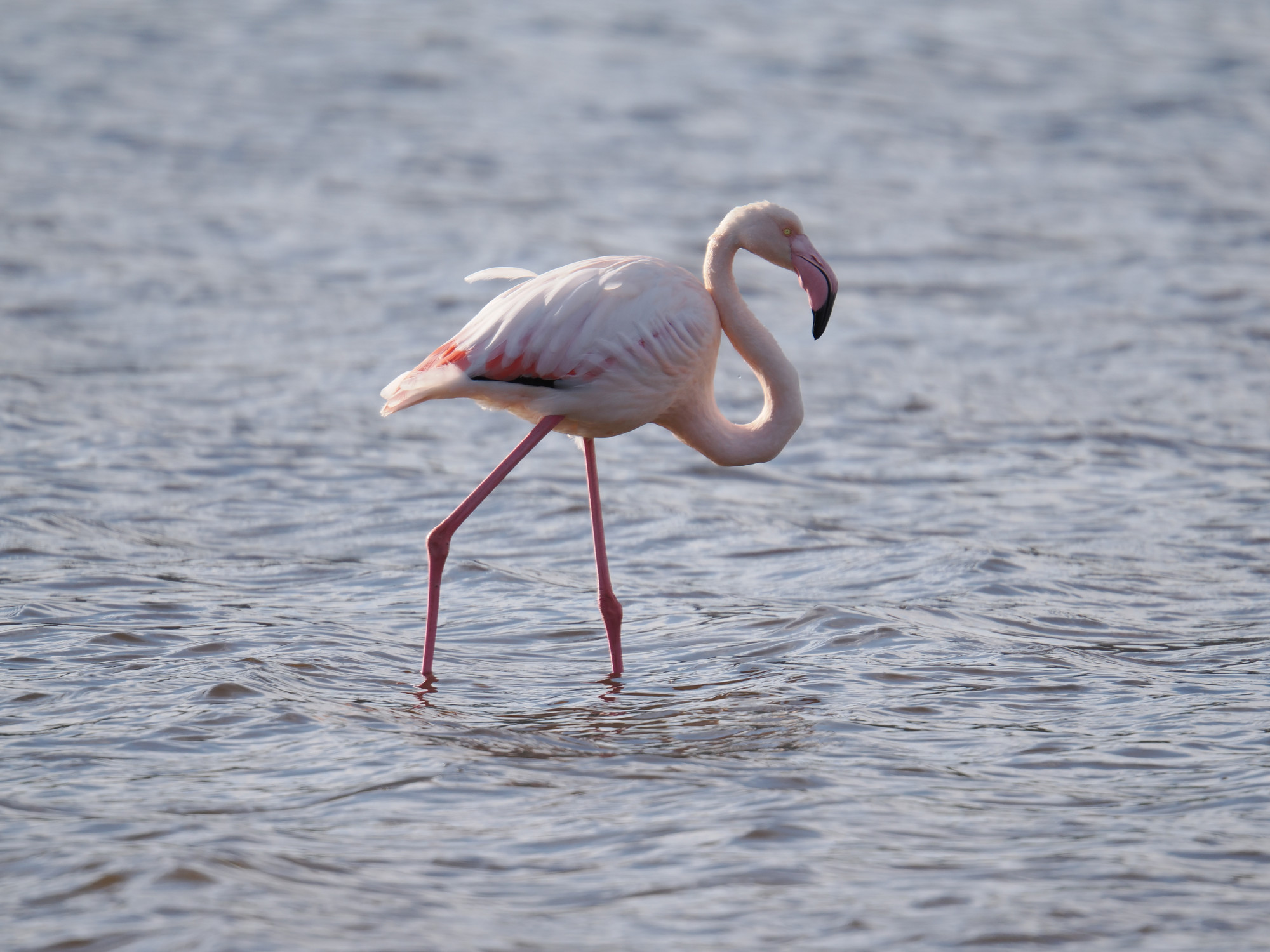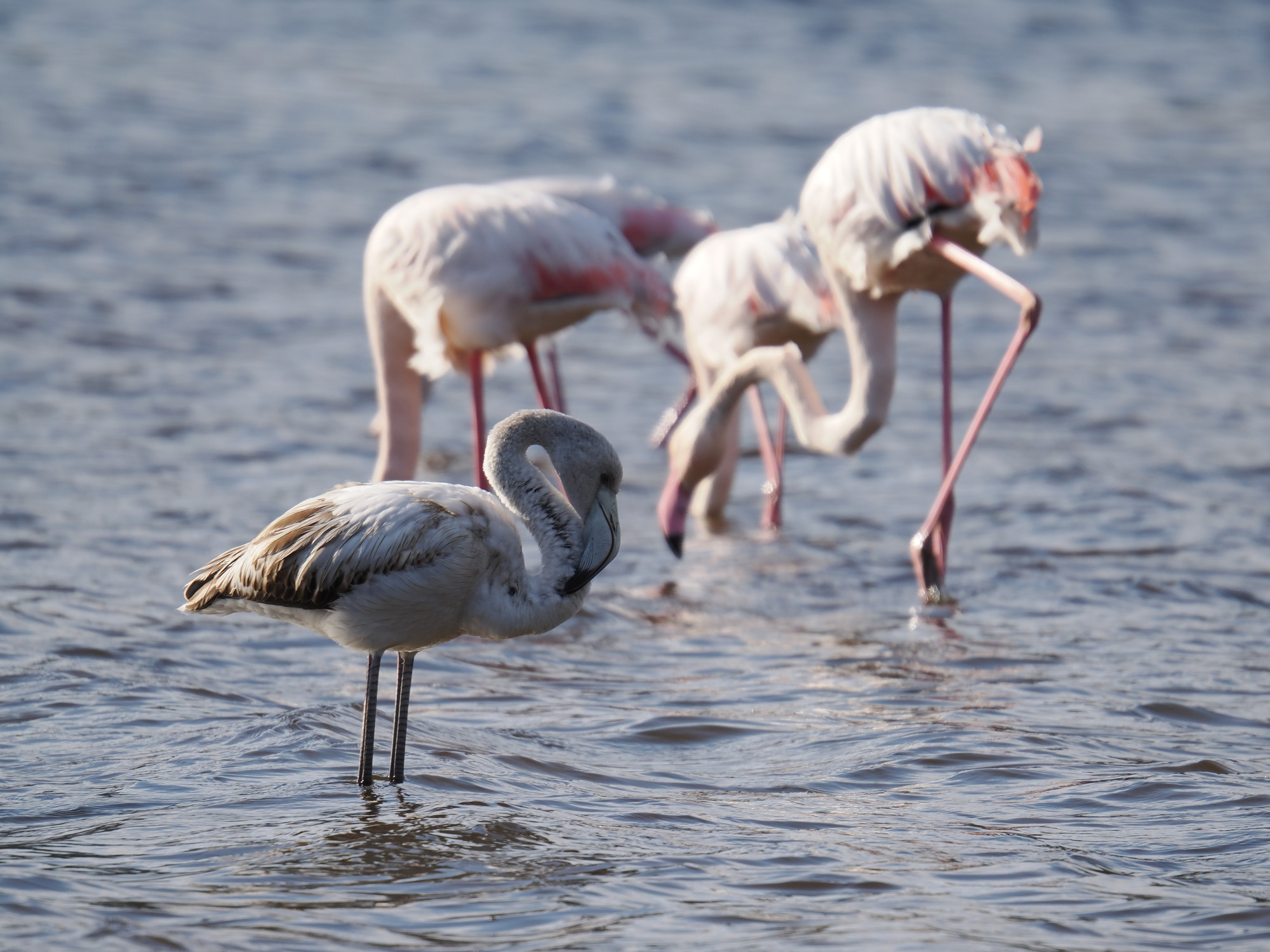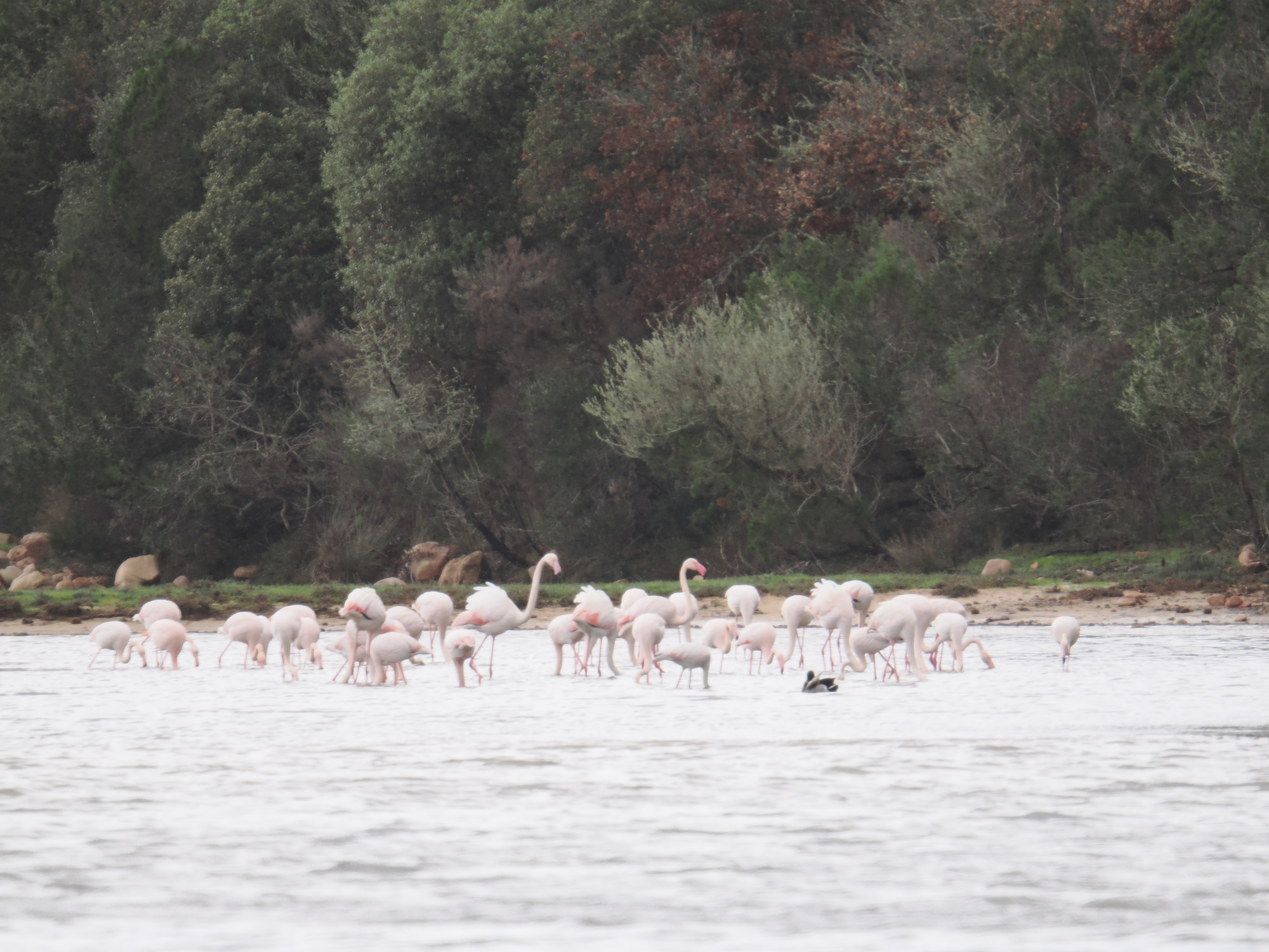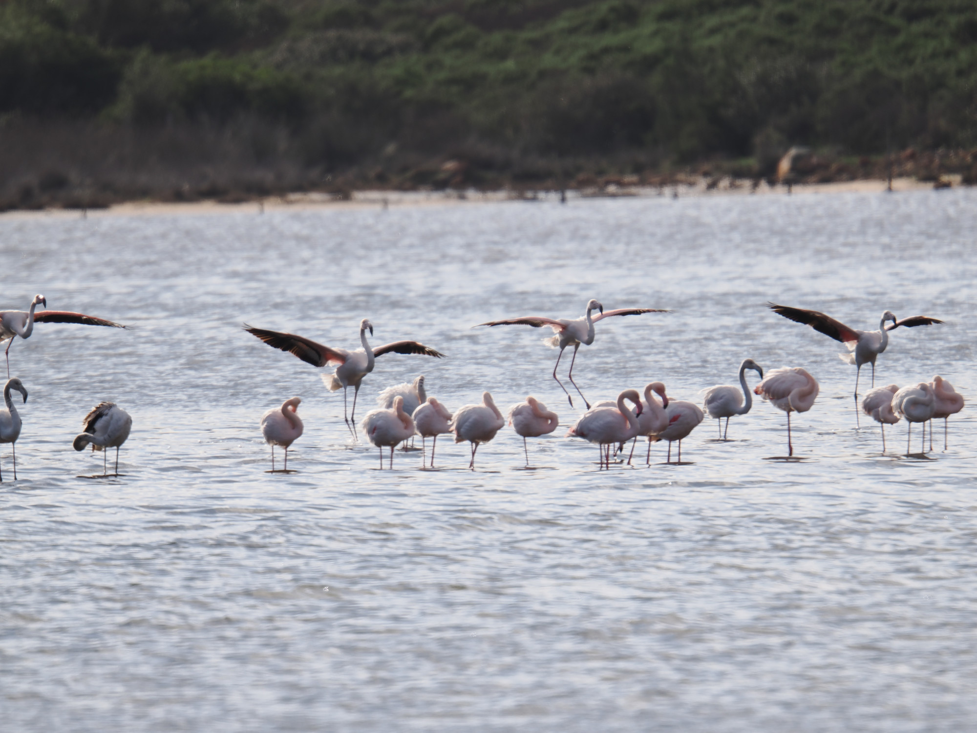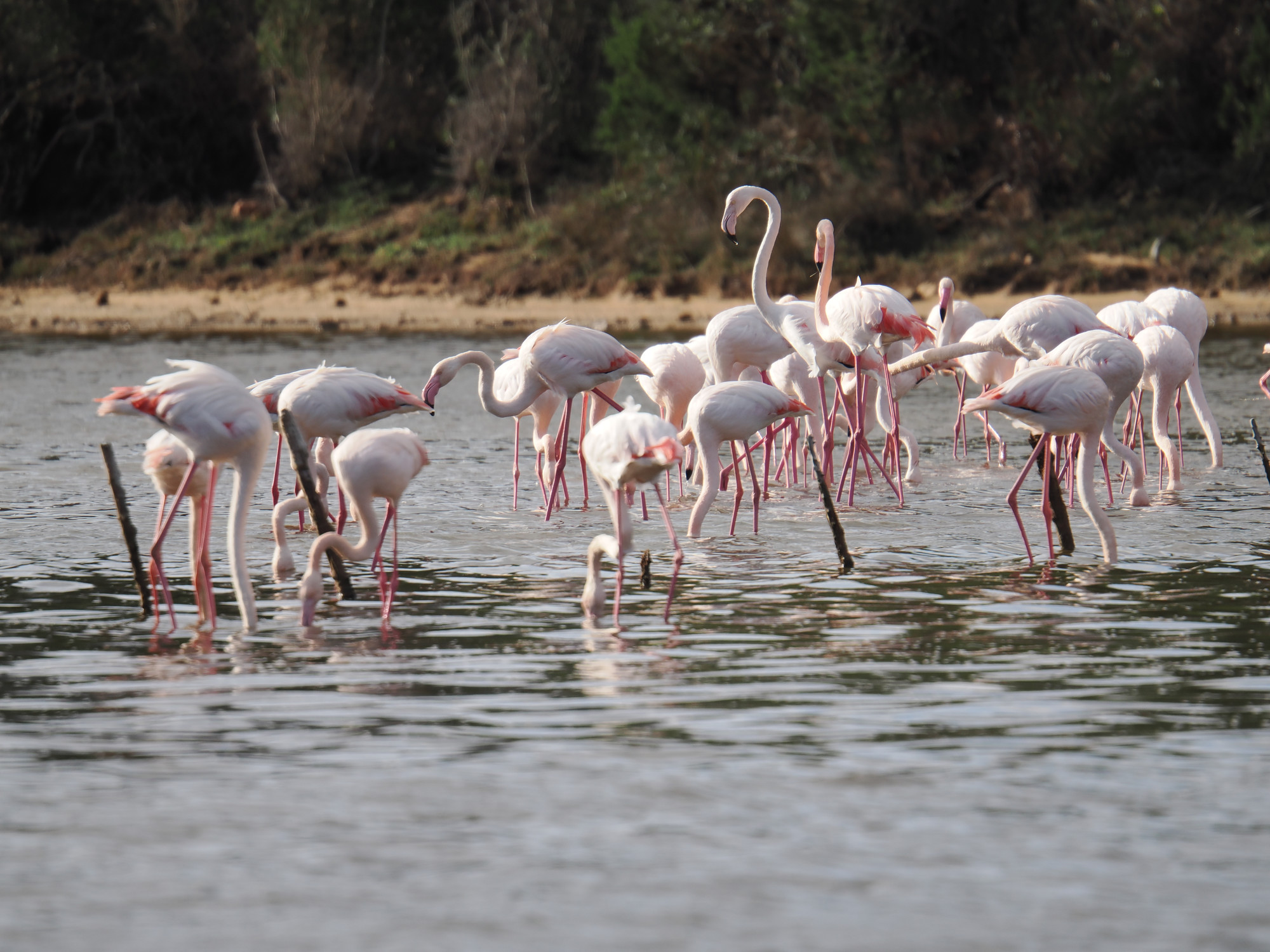 Auf dem Rückweg gehen wir noch einmal bei den Flamingos vorbei. Die sind mittlerweile auf unsere Seite der Lagune gekommen. Die Lagune ist nicht sehr tief, die können da bequem durch laufen.