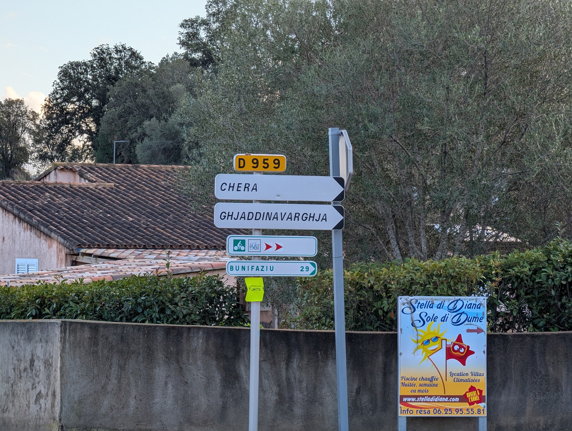 In Pianottoni gehen wir einkaufen und entdecken den Wegweiser nach Ghjaddinavarghja. Laut Wikipedia bedeutet der korsische Ortsname “Bunte Henne” oder “Henne in vielen Farben”. Mit 15 Buchstaben ist es einer der längsten Ortsnamen Frankreichs. Und zumindest für mich ist er unaussprechlich.